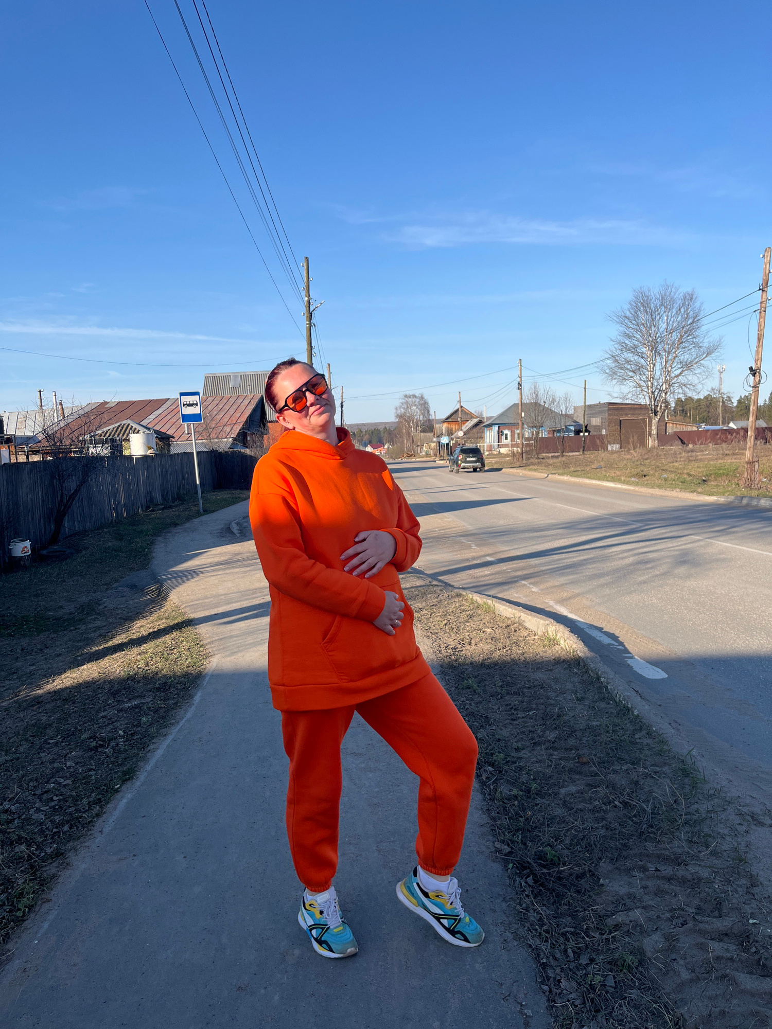 The image captures a person standing on a sunny day in a semi-rural or village setting in Chaikovsky, Russia. The individual, appearing to be an adult, is dressed in a bright orange tracksuit and dark…read more