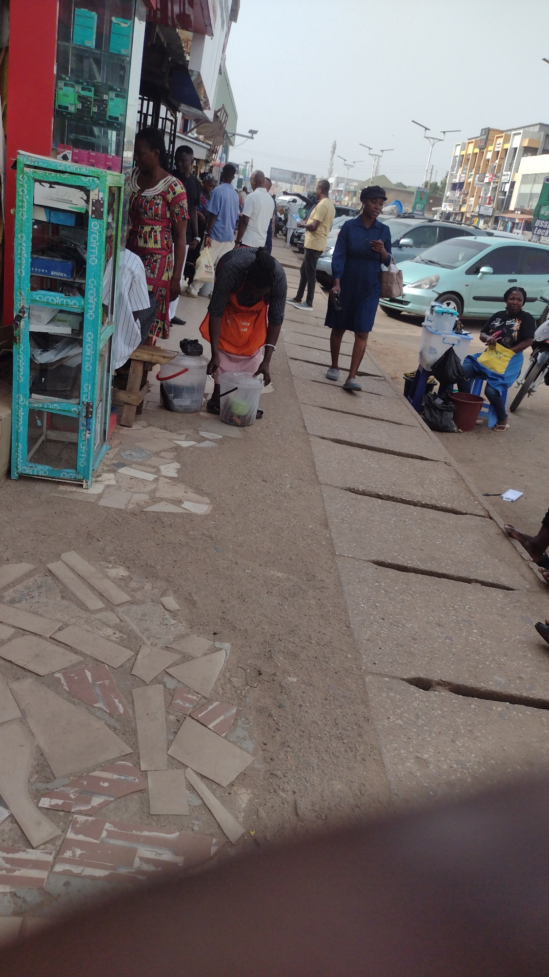 The image shows a street scene in Jos, Nigeria, featuring a mix of commercial and pedestrian activity. People: Several individuals are present. One woman in a blue dress is walking. Another person is…read more