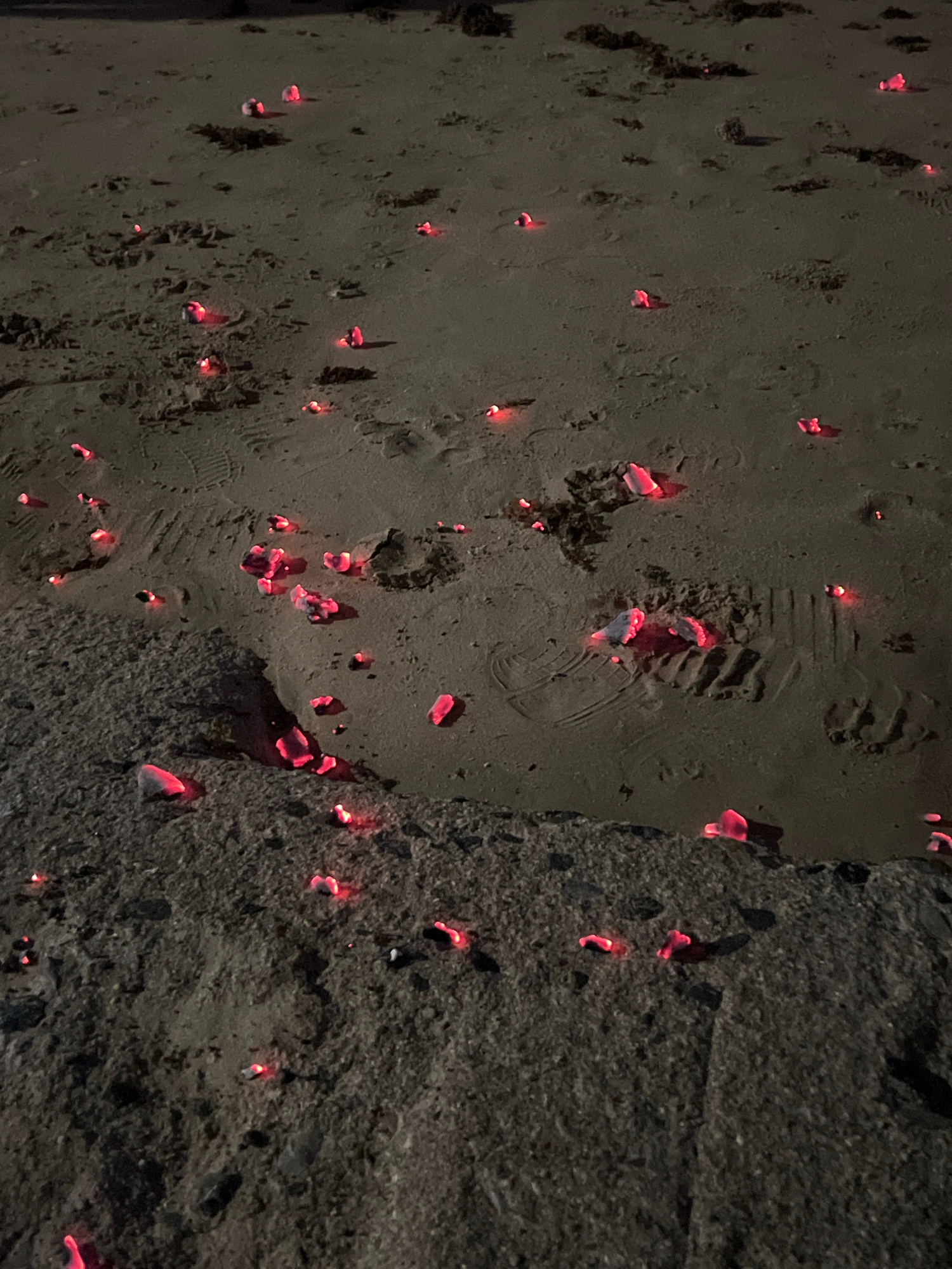 The image depicts a sandy or ashy surface, possibly a beach or construction site, littered with numerous small, glowing red objects. These objects are scattered across the surface and partially embedd…read more