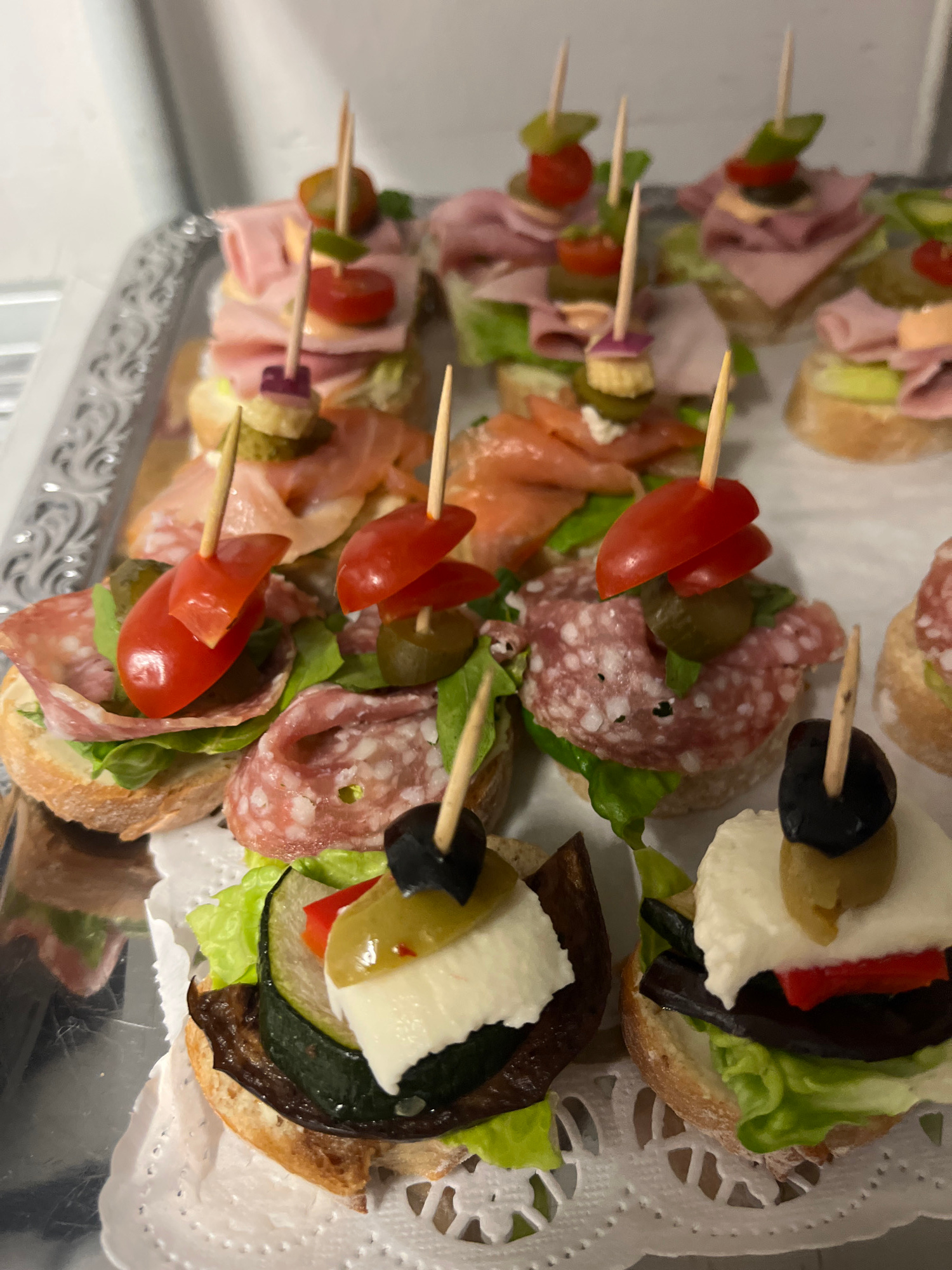 A platter of assorted hors d'oeuvres sits on a white, lacy paper doily. The appetizers appear to be small sandwiches or open-faced snacks on pieces of bread. Some are skewered with toothpicks, holding together ingredients such as ham, salami, mozzarella, tomatoes, pickles, olives, lettuce, and roasted vegetables. The arrangement indicates a catered event or a party setting. No information is present to suggest any interaction or location of the setting, except for the absence of location information. | Open Wire