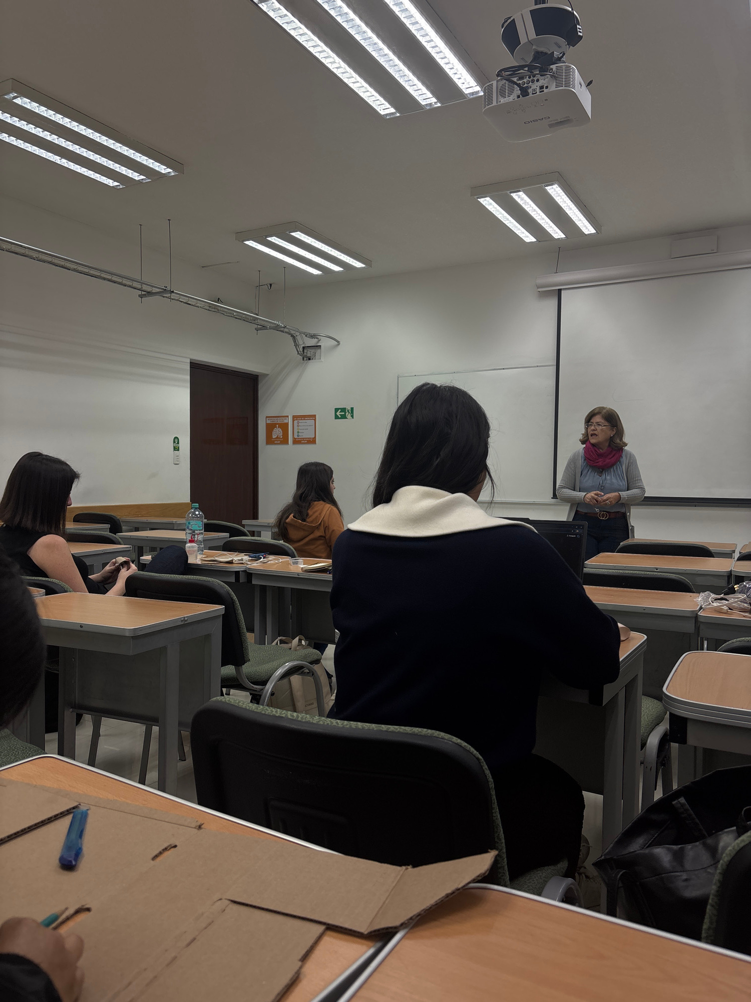 The image depicts a classroom scene at a university in San Andrés Cholula, Mexico. A female instructor stands at the front of the room by a projector screen. A class of students sits at desks, facing…read more