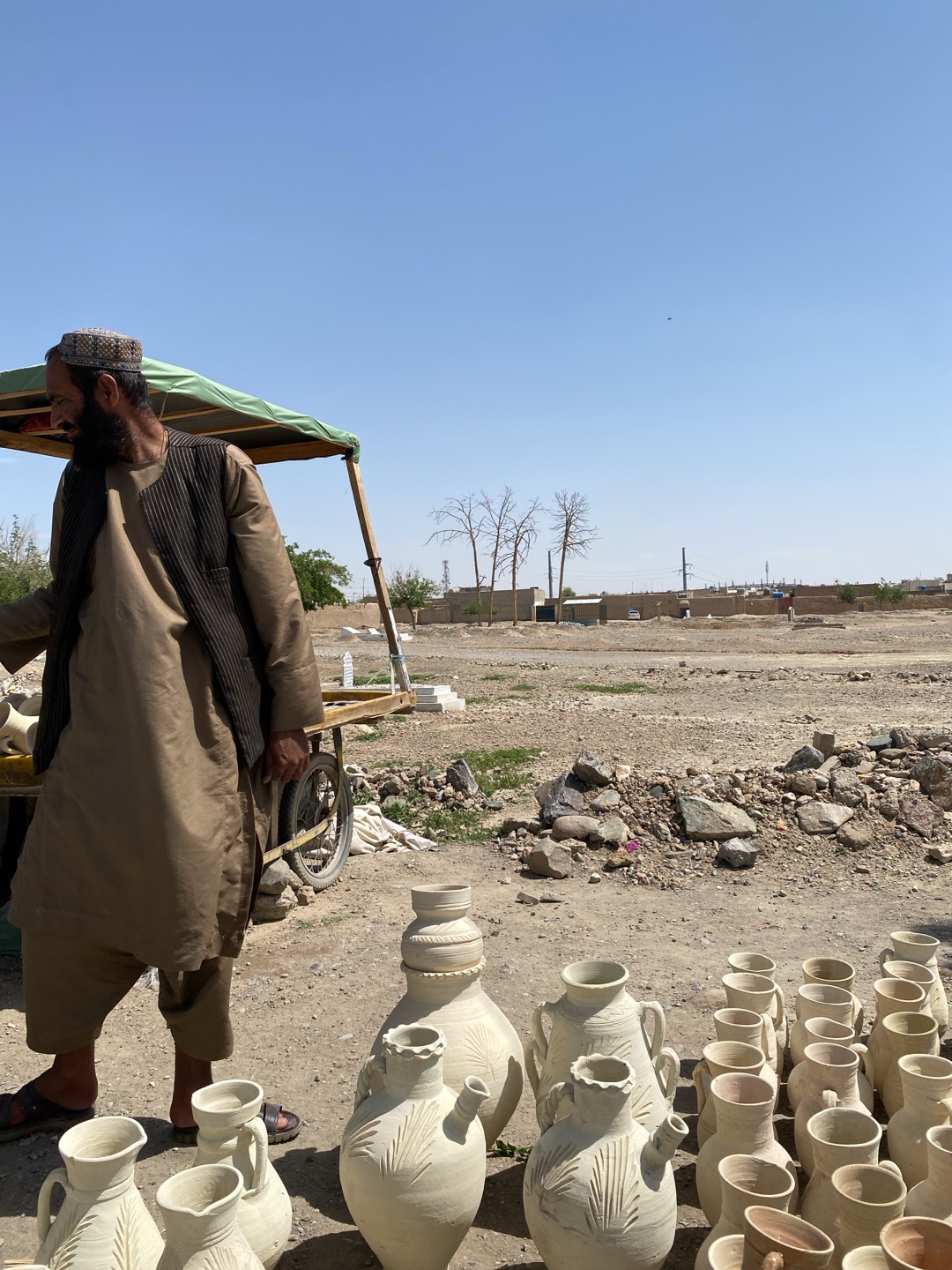 The image shows a man standing next to a cart with a green awning, with a collection of clay pots and jugs in the foreground. The man is wearing traditional Afghan clothing: a head covering, a long br…read more