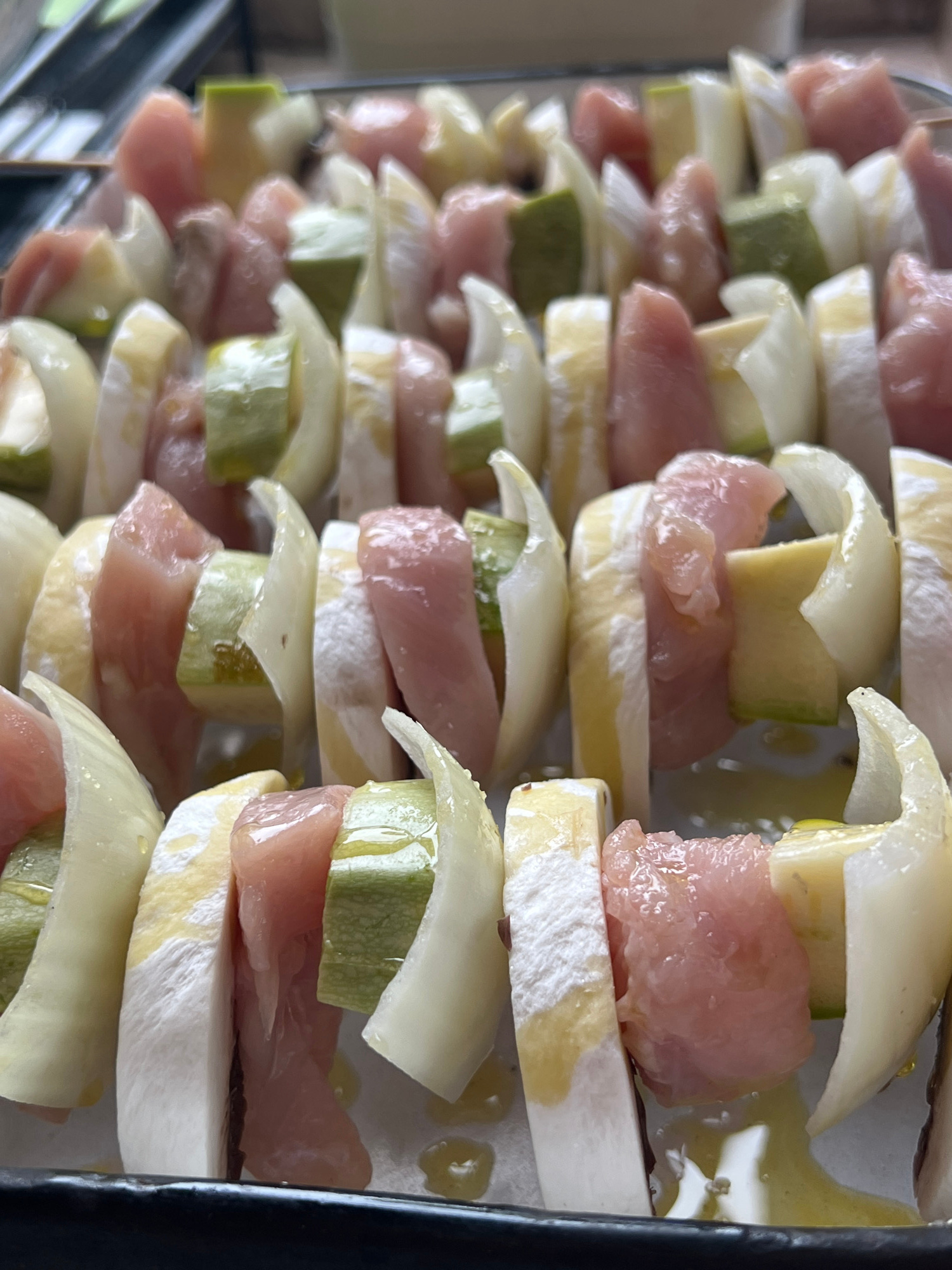 The image shows several skewers filled with alternating pieces of chicken, zucchini and onion. It is unclear if this is in Elena, Bulgaria, as the image provides no location context. The skewers appea…read more
