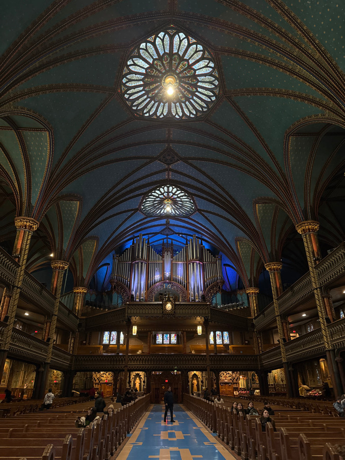 The interior of Notre-Dame Basilica showcases elaborate Gothic Revival architecture. Intricate patterns adorn the teal-colored ceiling, punctuated by two ornate rose windows. Massive organ pipes are i…read more