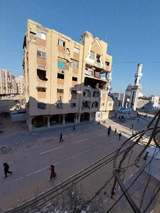 The image depicts a heavily damaged urban street scene in the city of Khan Yunis, Palestinian Territory, under a clear blue sky. A multi-story, tan-colored building, appearing to be a residential complex, stands prominently in the center-left. This building exhibits extensive structural damage, including large sections of missing exterior walls, exposed interior rooms, broken windows, and visible impact points across its facade. Debris, including a blue tarp and clothing, hangs from damaged balconies and openings. To the right of this building, a mosque structure is severely damaged, with its minaret partially collapsed and leaning, and the main dome section reduced to rubble. In the foreground, an asphalt road with a double white centerline traverses the scene. Approximately 10 to 15 individuals, predominantly dressed in dark clothing, are observed walking on the road and along its debris-strewn verges. One person in the foreground wears a reddish-brown garment. In the far background, additional multi-story buildings, also appearing damaged, are visible. Overhead utility wires are present in the lower right foreground. Long shadows are cast by the structures and individuals, indicating a low sun angle. The ground surrounding the structures is covered in rubble and debris. | Open Wire