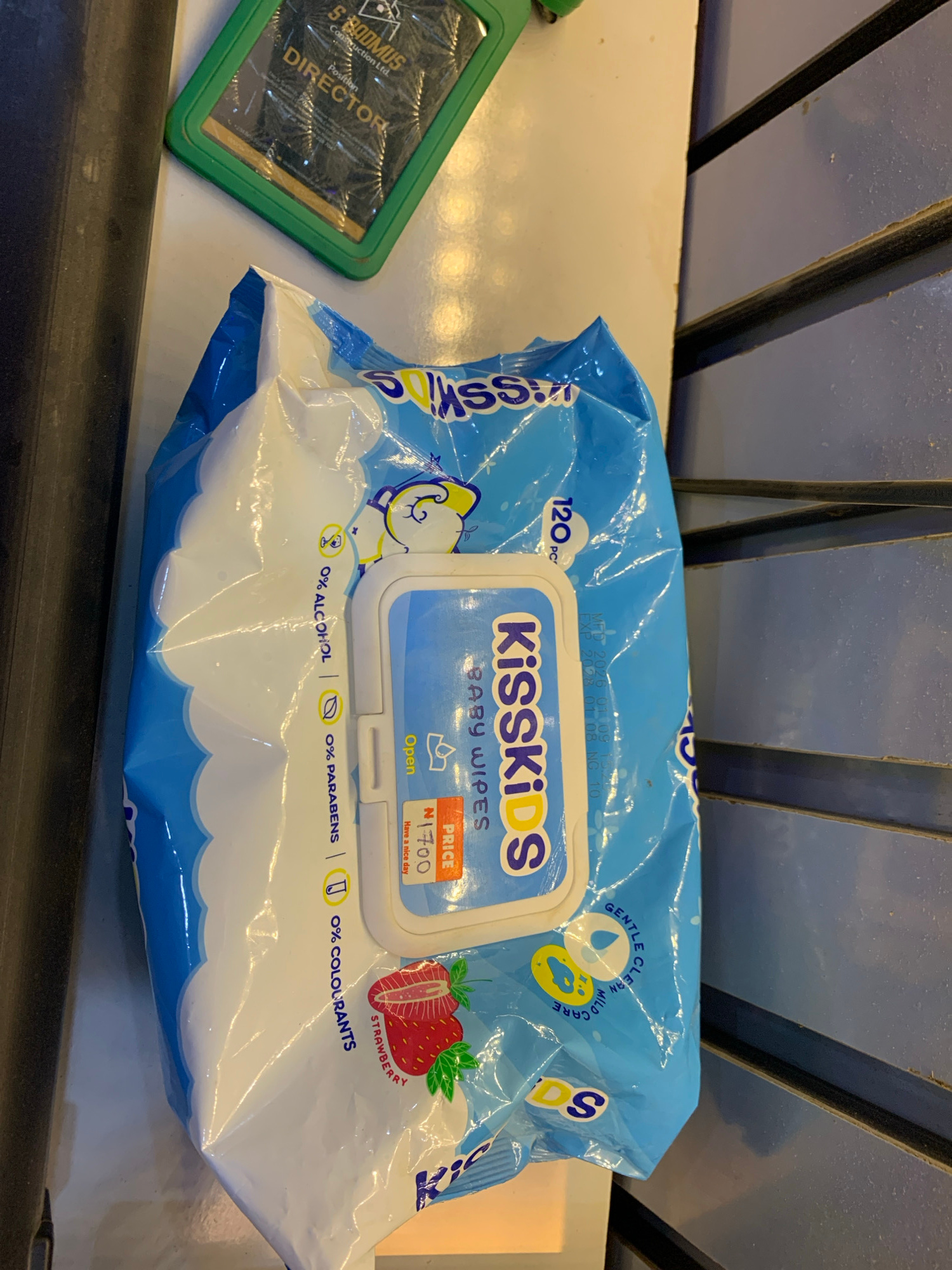 A slightly crumpled package of "Kisskids" brand baby wipes sits on a smooth, pale surface. The packaging is blue and white and features cartoon graphics, including a strawberry and an elephant. The wi…read more