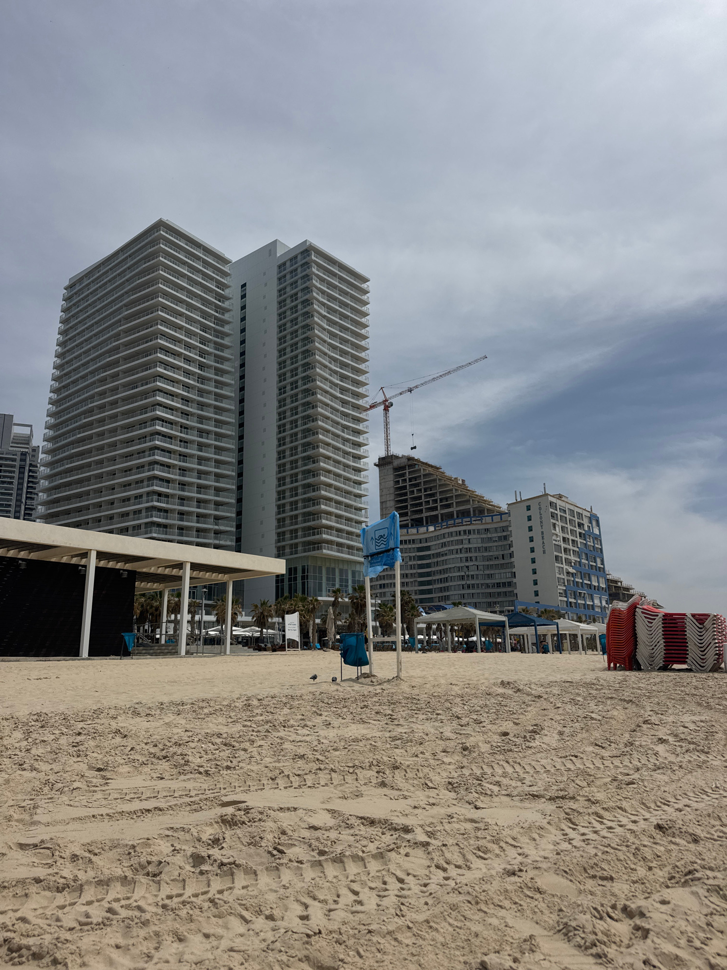 The image depicts a view of the beach in Bat Yam, Israel. To the left are two high-rise apartment buildings with white facades and balconies. Further back is another building with exposed construction…read more