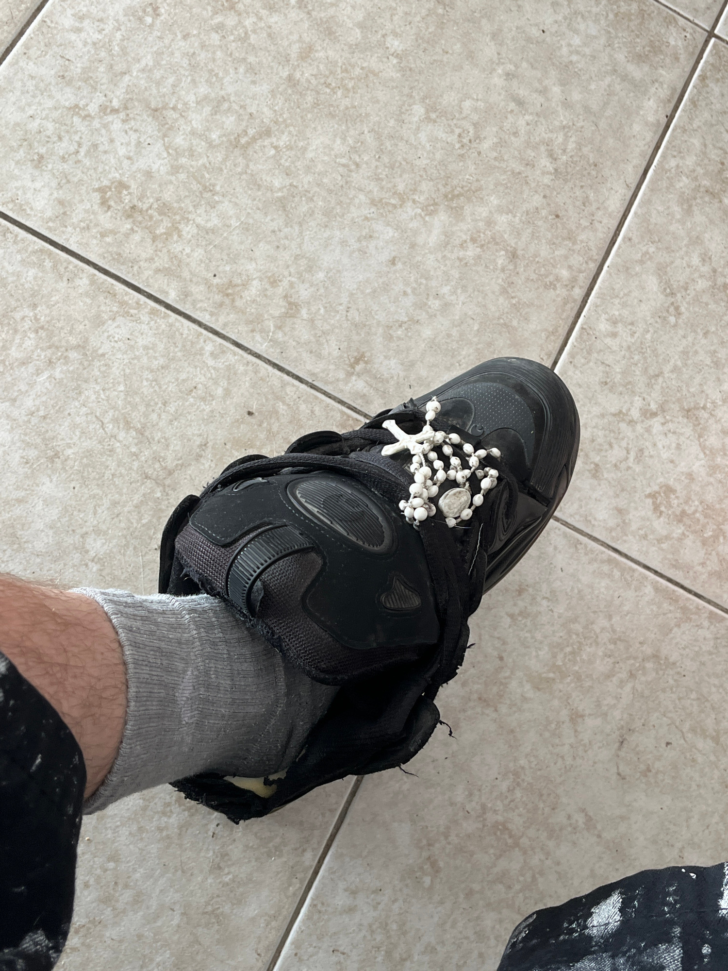 The image shows a person's foot wearing a black athletic shoe, a grey sock, and black clothing with white paint splatters. The shoe is adorned with a white rosary. The person is standing on a light be…read more