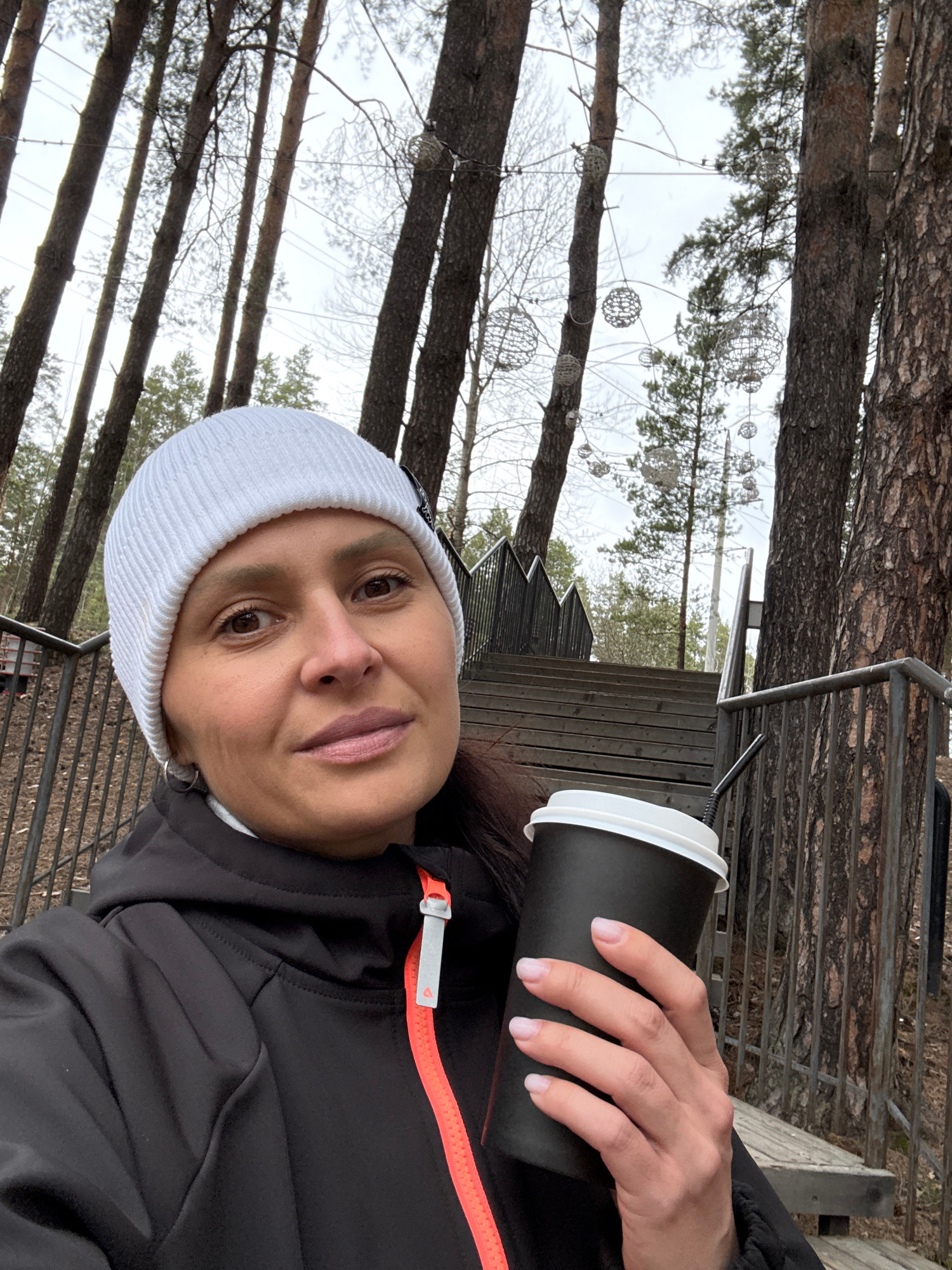 A woman wearing a white beanie and a black jacket with orange trim is holding a black disposable coffee cup with a white lid. The photo is taken outdoors in what appears to be a wooded area. Tall tree…read more