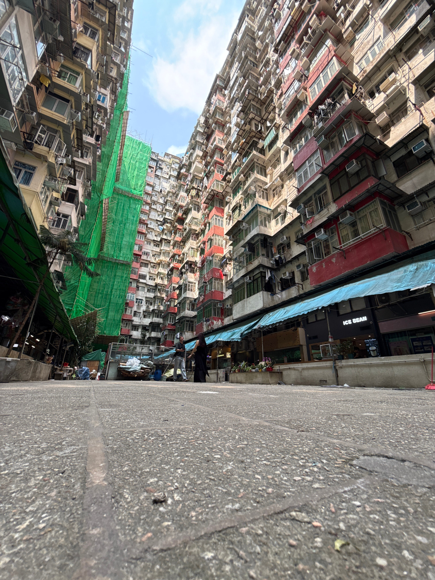 The image shows a narrow street view in Hong Kong, China, with dense residential buildings towering on either side. The buildings are characterized by a multitude of small apartments, each with numero…read more