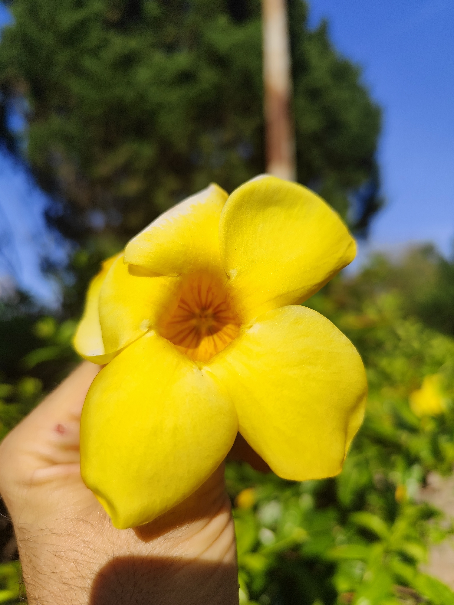 A yellow Allamanda flower is being held in a person's hand. The flower has five petals and an orange center. The background consists of green foliage, a blurred brown pole, and a blue sky. The locatio…read more