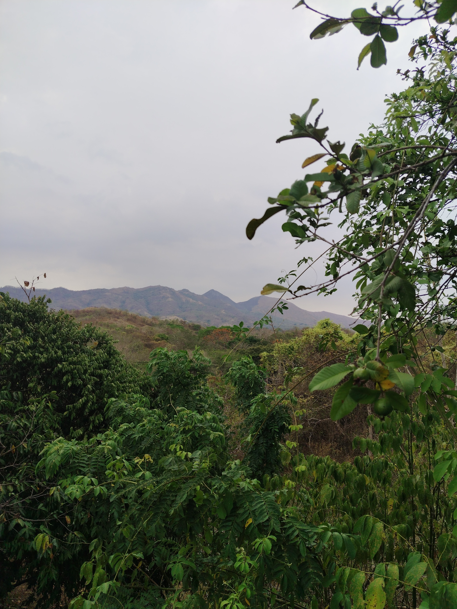 The image depicts a landscape in Tinaquillo, Venezuela, featuring a vista of mountains partially obscured by lush, green foliage in the foreground. The sky is overcast with a gray cloud cover. The mou…read more
