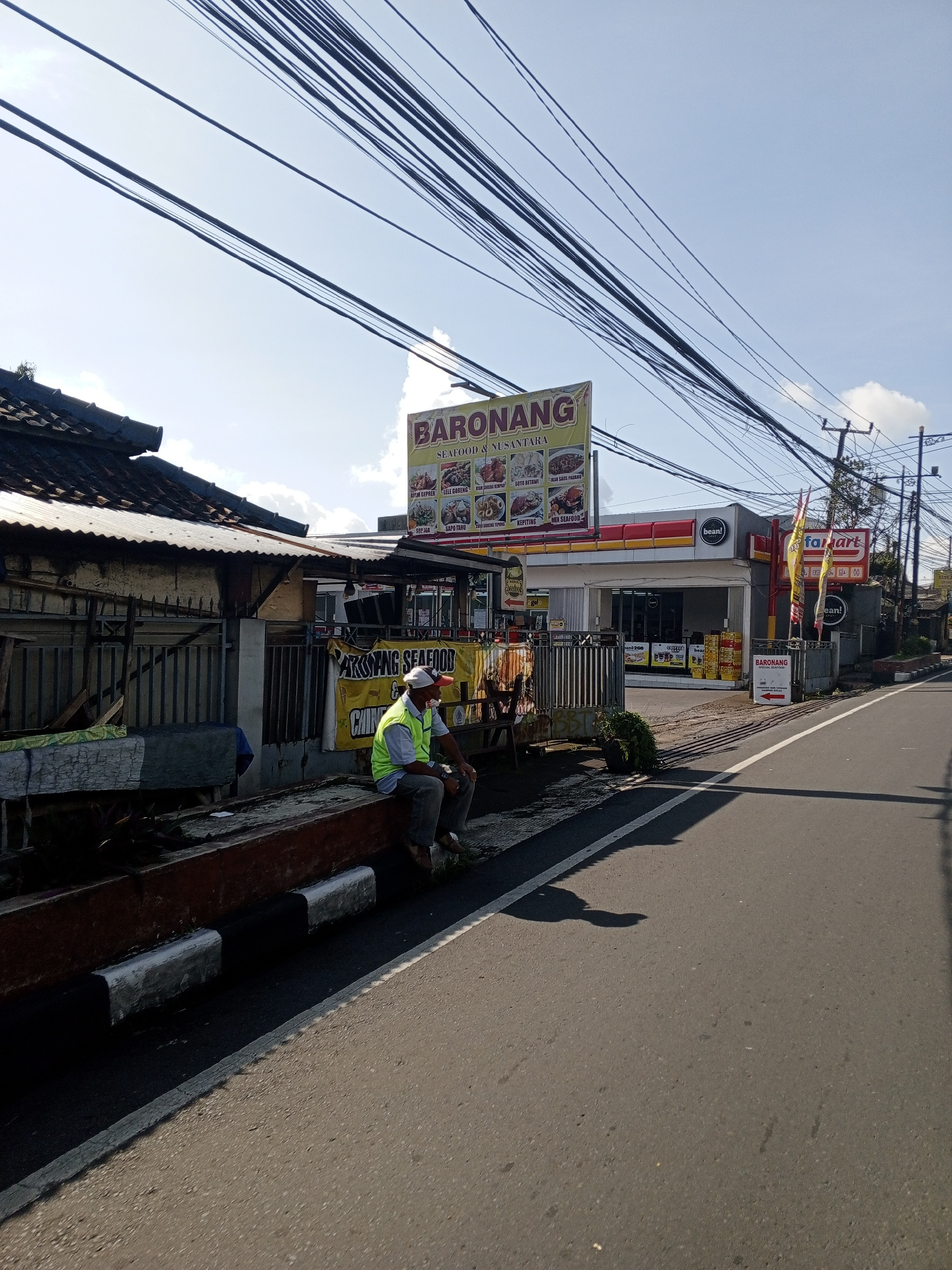 A daytime shot shows a street scene. The street, stretching towards the viewer, has a shadow cast across it. A man wearing a white hat and bright yellow vest sits on the curb, his shadow elongated beh…read more