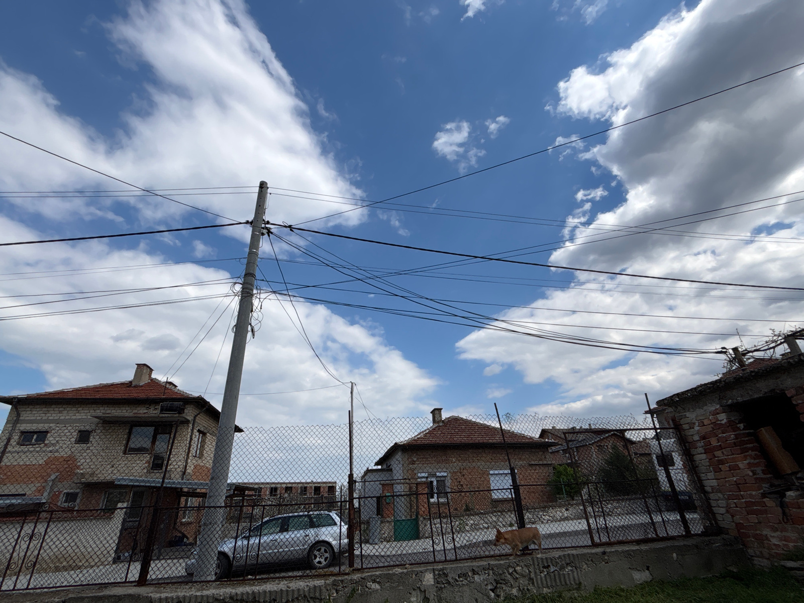 The image captures a street scene in Kuklen, Bulgaria, featuring residential brick buildings with red tile roofs behind a chain-link fence. A silver station wagon is parked behind the fence. An orange…read more