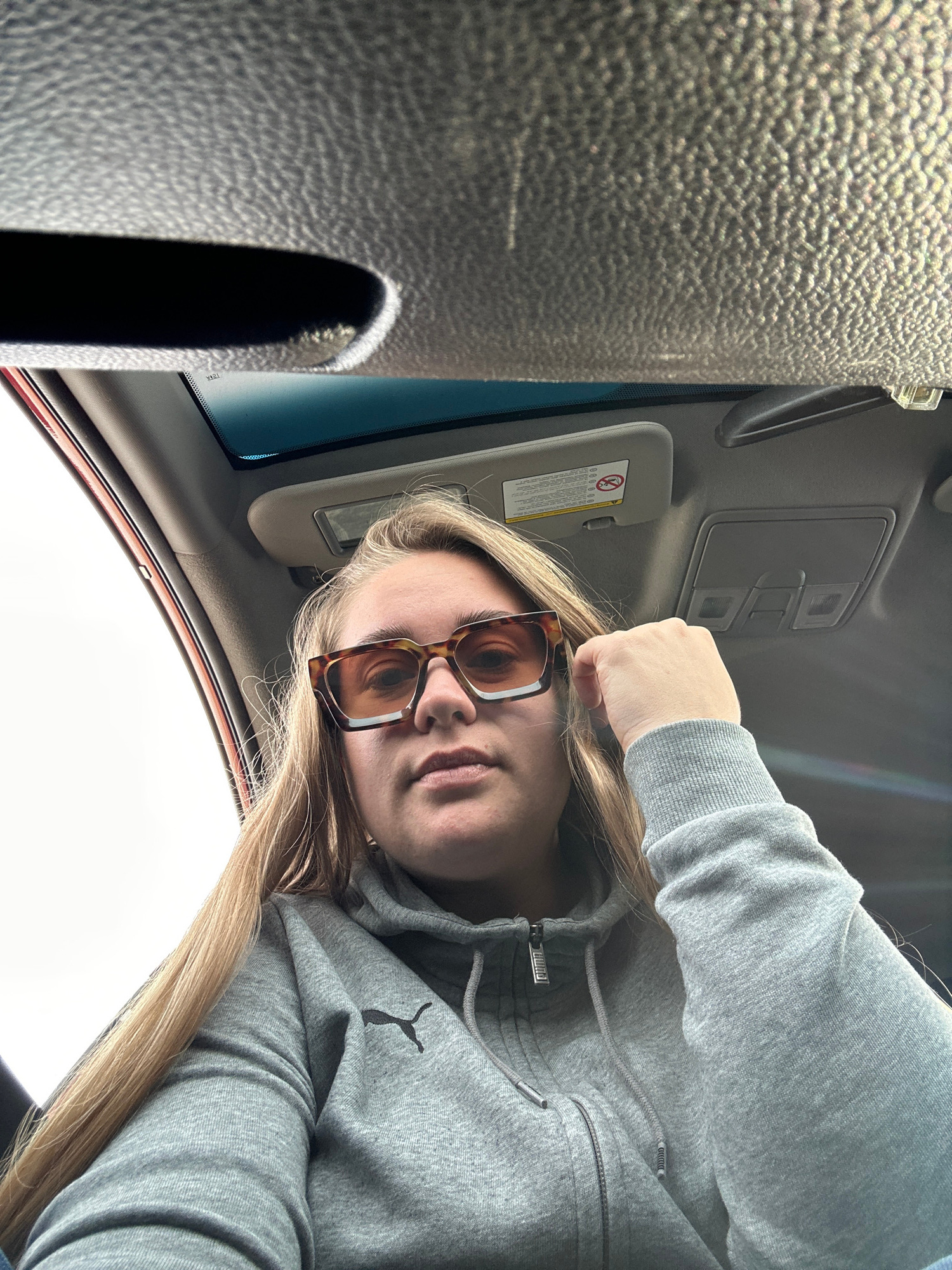 A female is positioned inside a vehicle. She is wearing a grey Puma hoodie and brown tortoise-shell eyeglasses. Her blonde hair is visible. Her hand is resting on the interior roof of the car. The car…read more