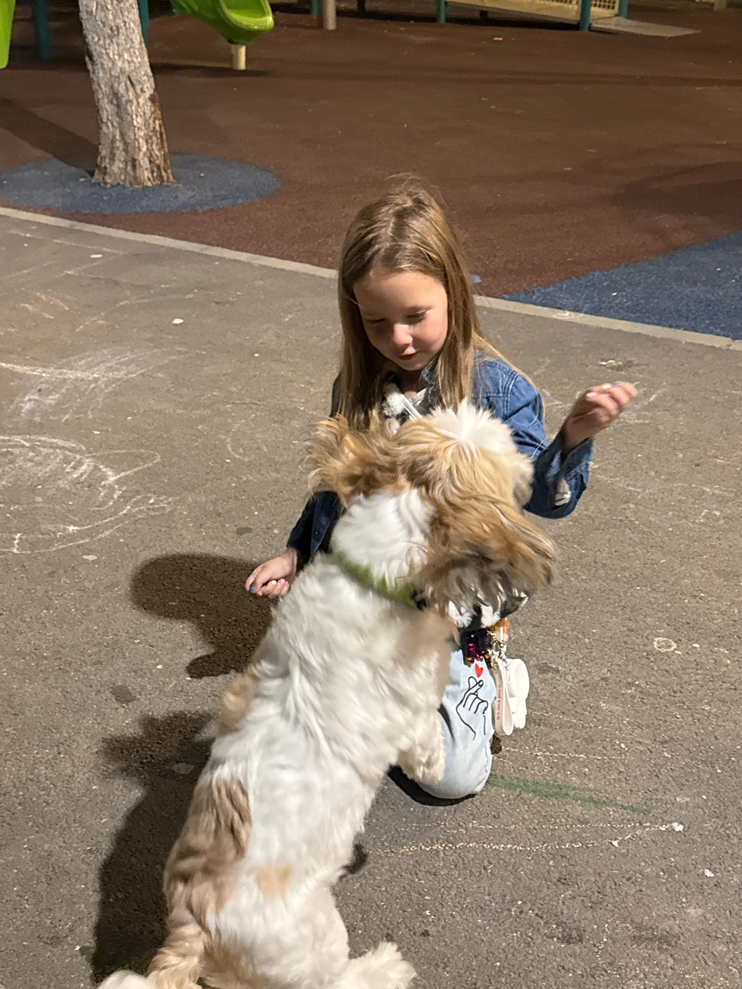 A girl with blonde hair is kneeling on a gray pavement, playing with a small, tan and white dog that is standing on its hind legs. The girl is wearing a blue denim jacket. A bag or pillow with a drawi…read more