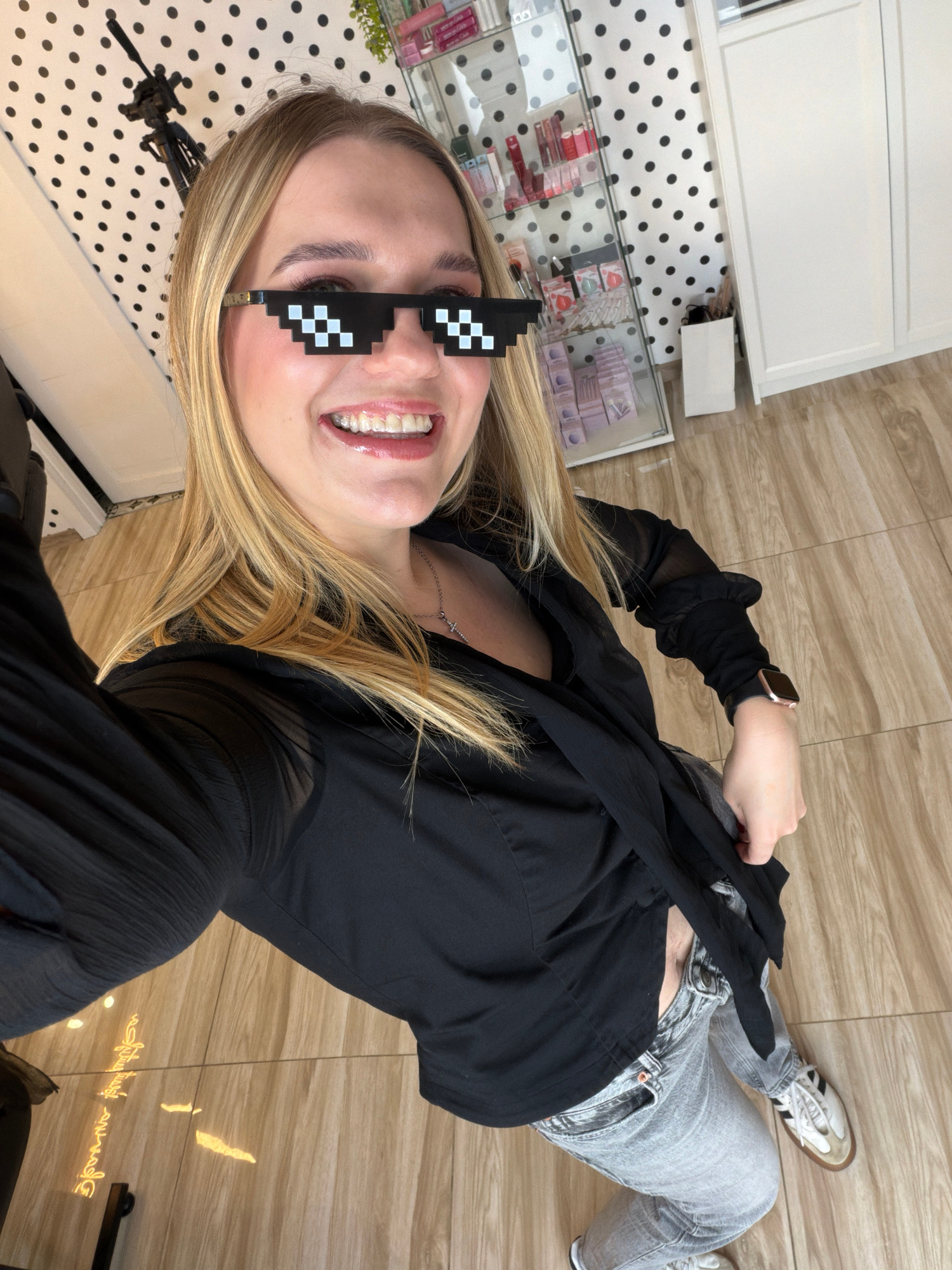 A young woman wearing pixelated sunglasses, a black blouse, and grey jeans is taking a selfie indoors. She's smiling and her phone is angled downward. The background includes a white cabinet, a polka-…read more
