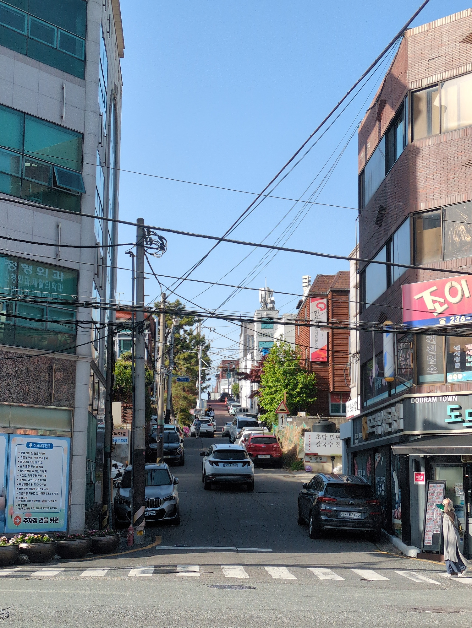 This image captures a bright, sunny daytime street scene in what appears to be a commercial district in Ulsan, South Korea. The perspective is looking down a street lined with multi-story buildings an…read more