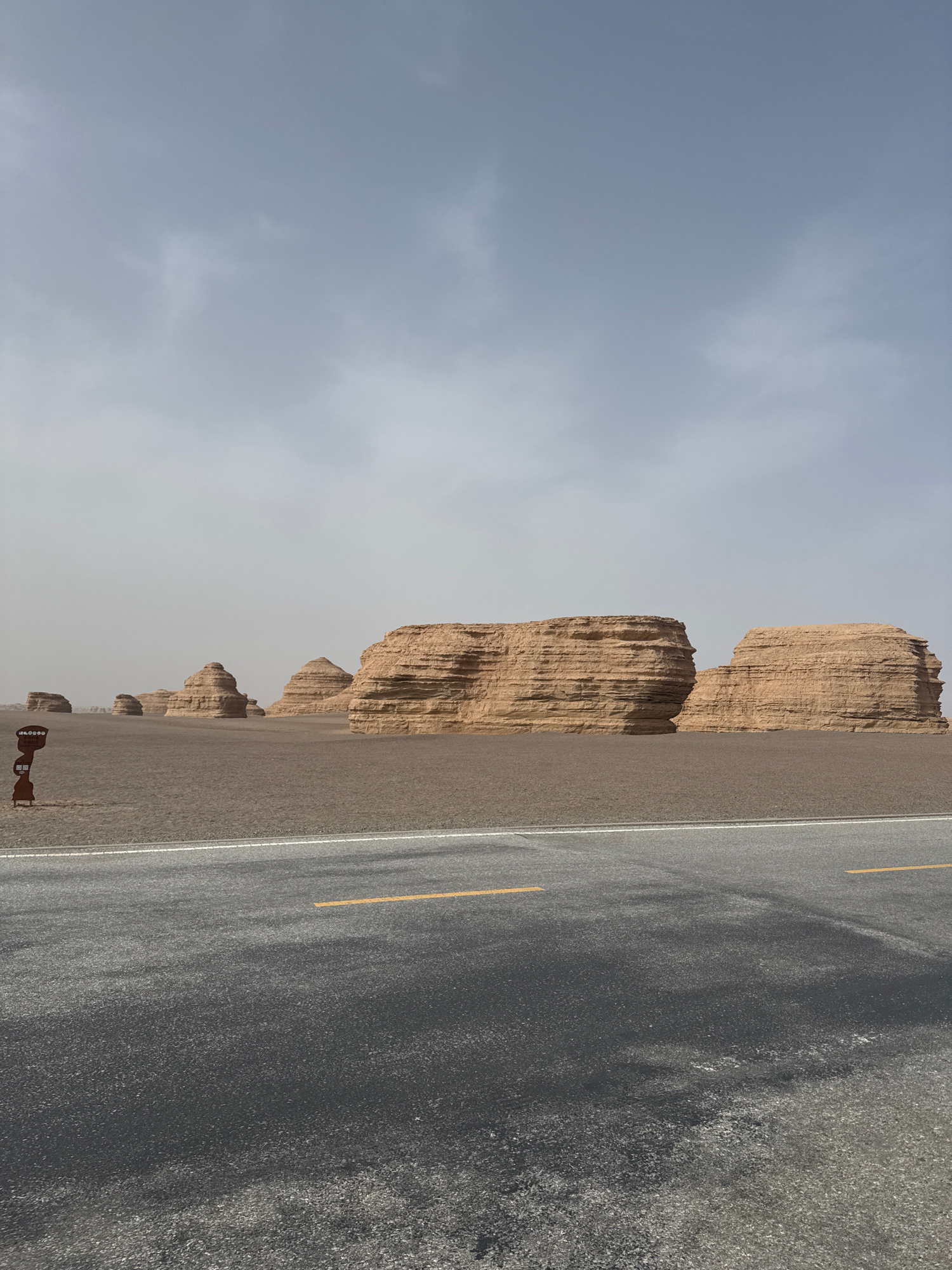 The image, oriented horizontally, depicts a remote desert landscape featuring unique geological formations, an asphalt road, and an expansive sky. The upper portion of the frame is dominated by a pale…read more