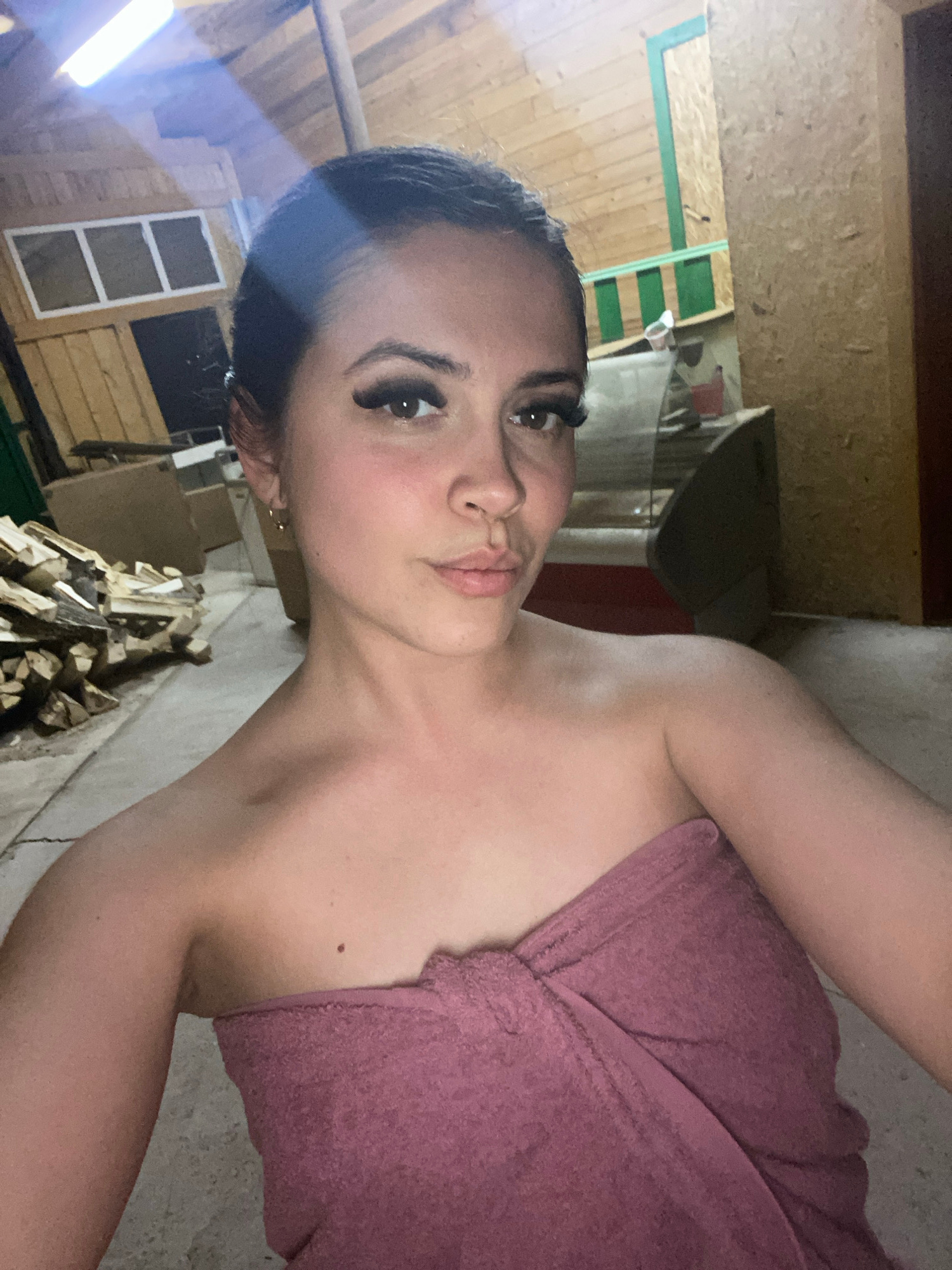 A woman is indoors, possibly in a barn or a shed. She is wrapped in a pink towel. In the background, there is a window, wood construction, a pile of firewood, and some containers. The woman appears to…read more