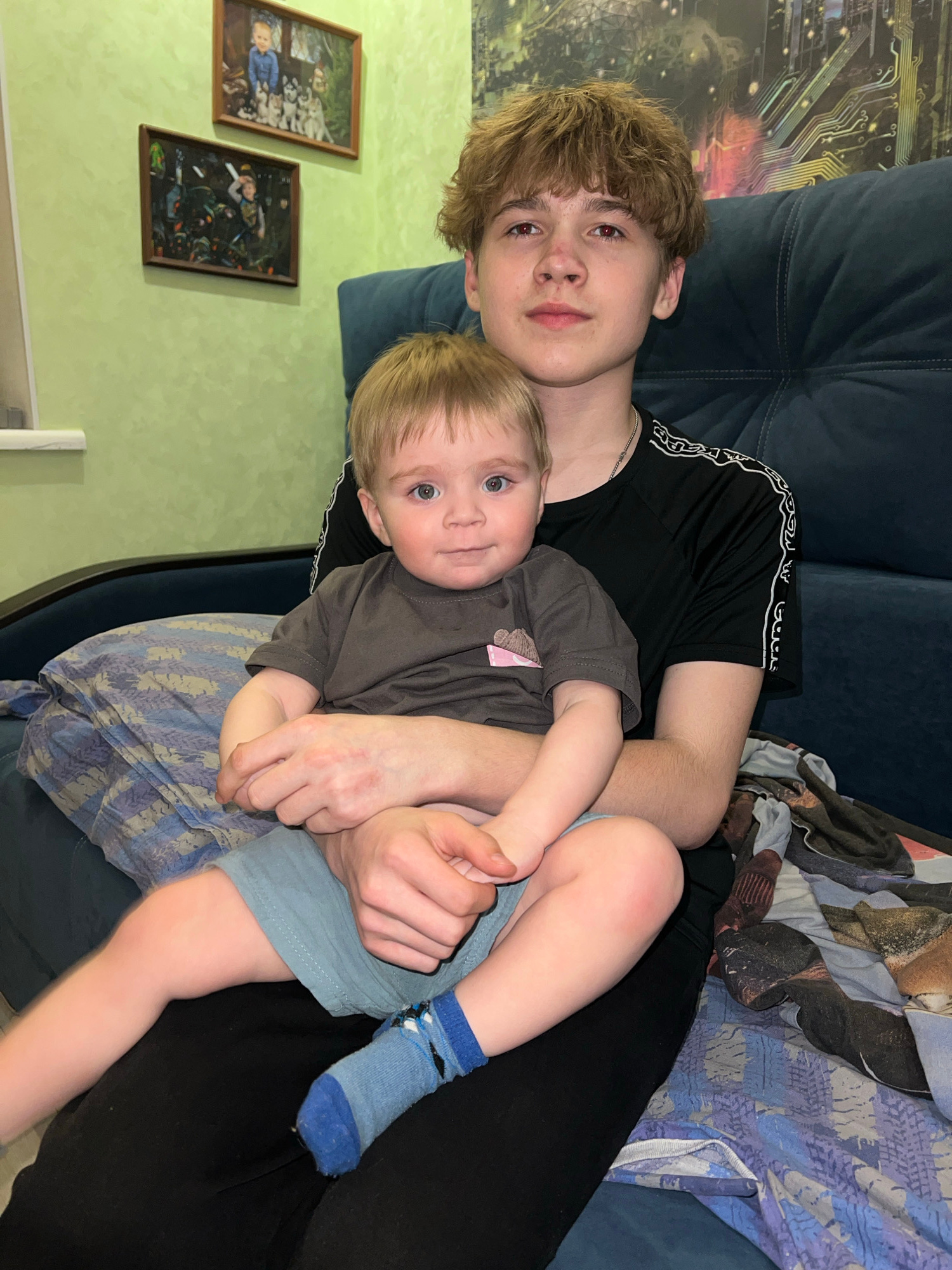 A Caucasian male with reddish-brown curly hair, fair skin, and wearing a black t-shirt with white stripes on the sleeves is lying on a dark blue couch. He is holding a toddler with fair skin and blond…read more