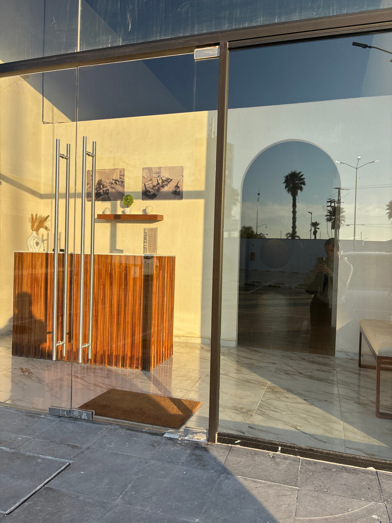 The image depicts the exterior of a storefront in San Bernardino Tlaxcalancingo, Mexico. The entrance is a glass door with multiple horizontal metal handles. Reflected in the glass are palm trees and…read more