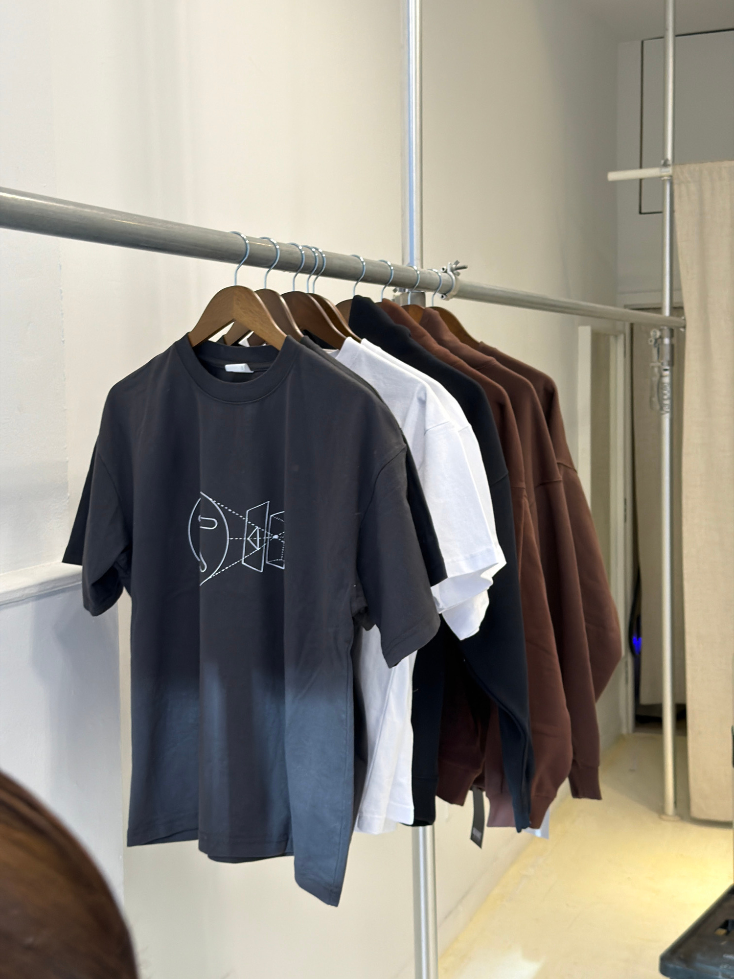 A rack of clothing is displayed in what appears to be a retail setting. On the rack, there are several items, including brown hoodies, black clothing items, white t-shirts, and dark gray or black t-sh…read more