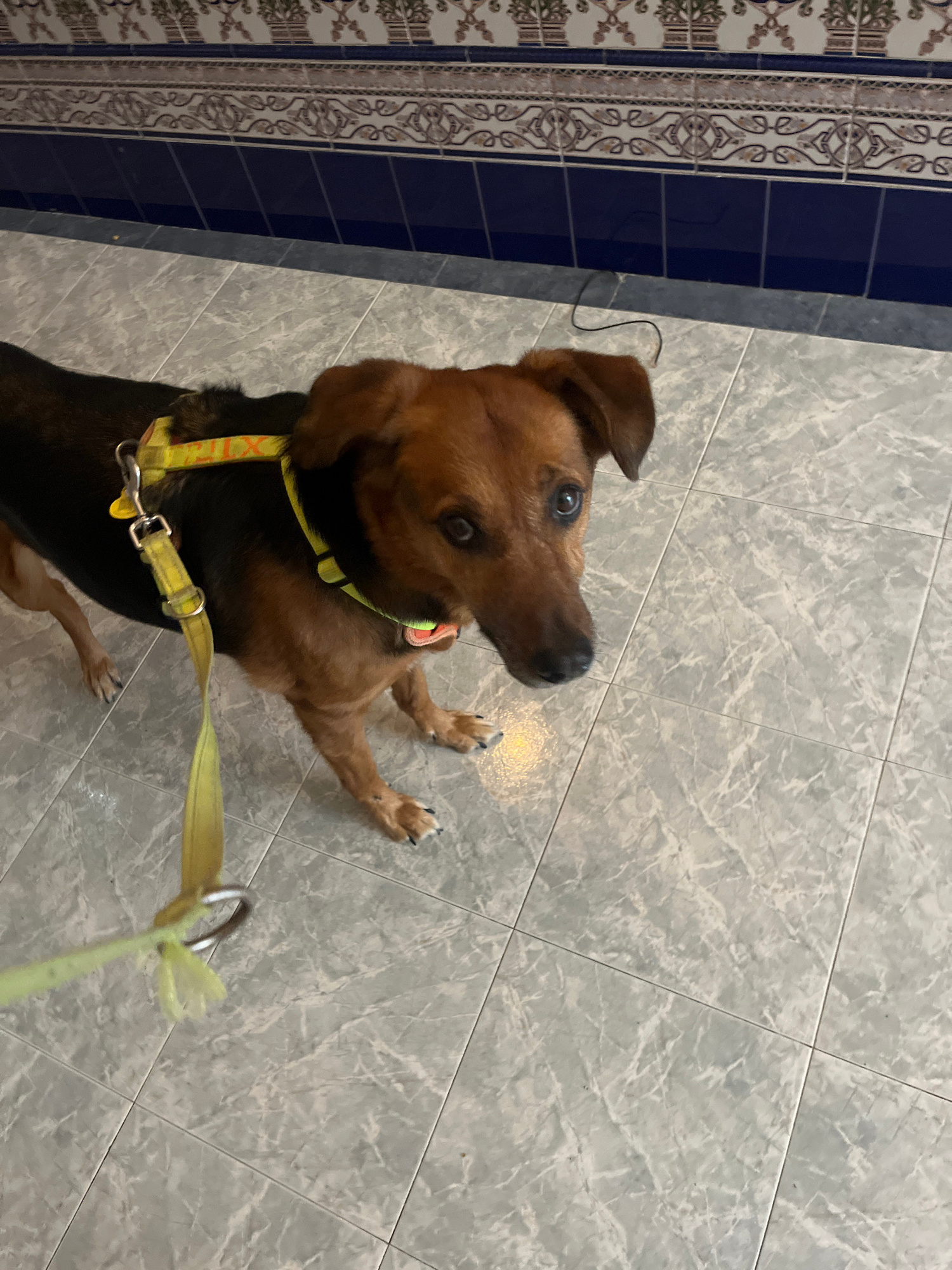 The image depicts a medium-sized, short-haired dog with brown and black fur, wearing a yellow harness and leash, standing on a light gray tiled floor. The dog is looking upwards. The background includ…read more