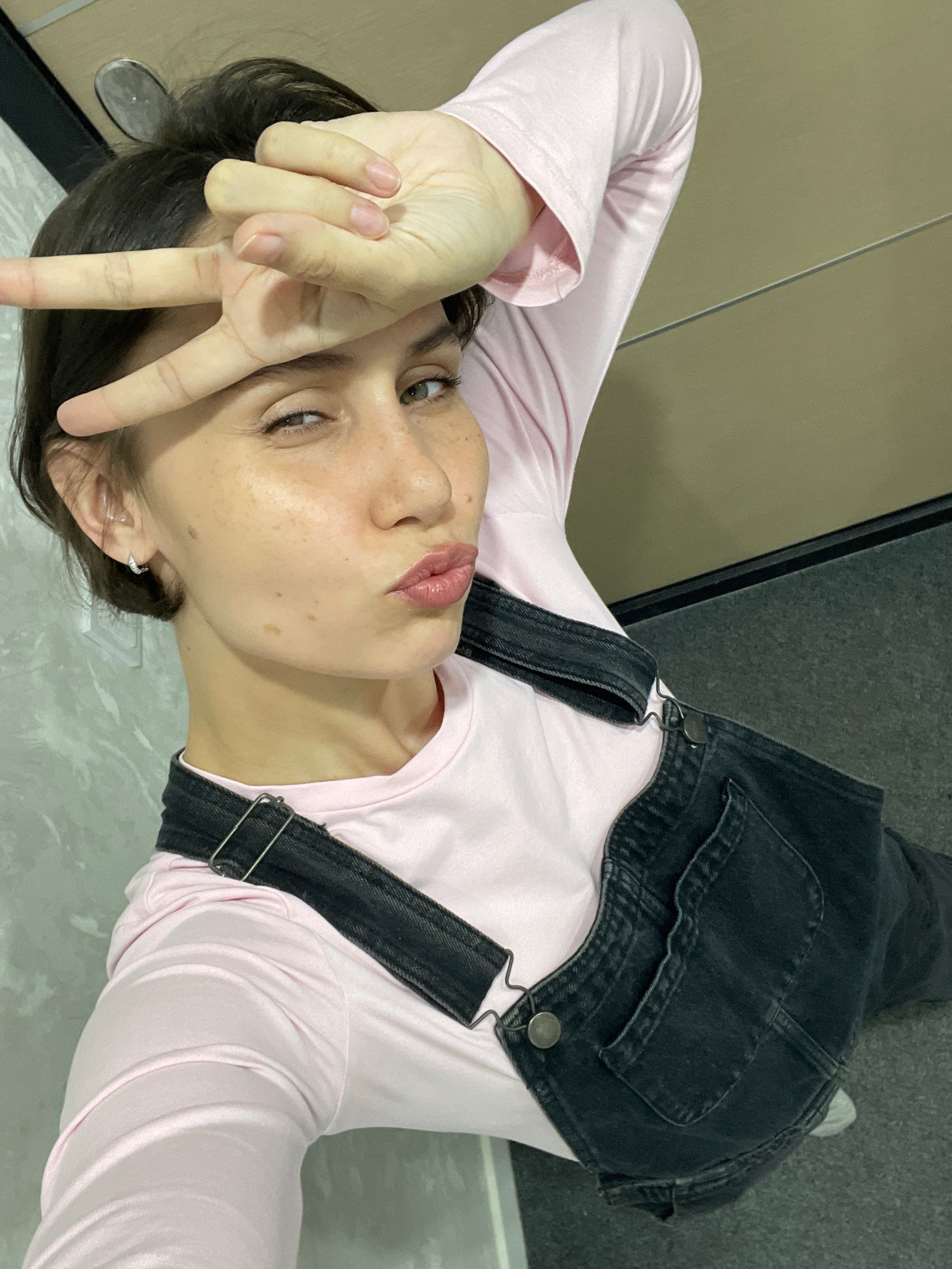 A young individual, appearing to be female, is captured in a selfie-style shot, lying down indoors. She looks directly at the camera, holding her right hand up near her face, making a "peace" or "V" s…read more