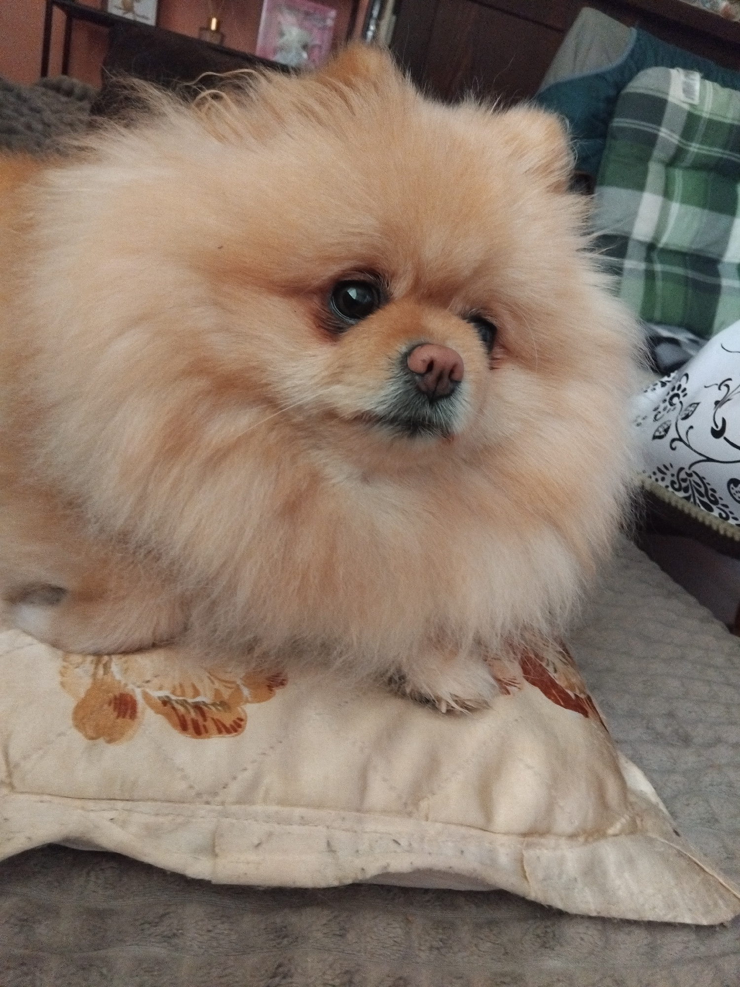 A close-up photograph shows a light-tan Pomeranian dog lying on a patterned pillow. The pillow has a beige-and-brown floral pattern on the visible portion, with a neutral-colored, possibly gray or bei…read more