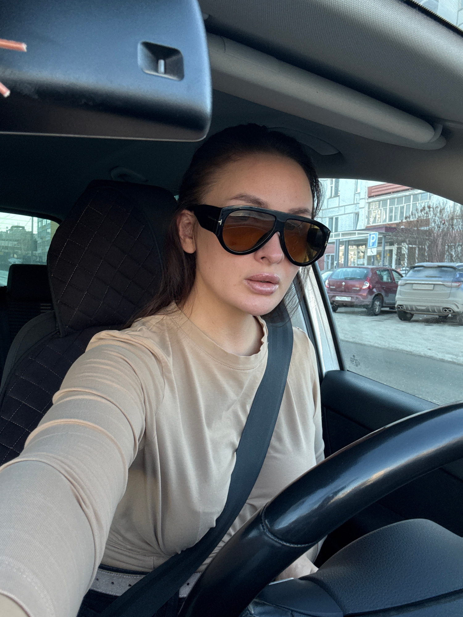 The image shows a woman sitting in the driver's seat of a car, wearing sunglasses and a seatbelt. The car is parked on a street in Chaikovsky, Russia, as evidenced by the cars and buildings visible th…read more