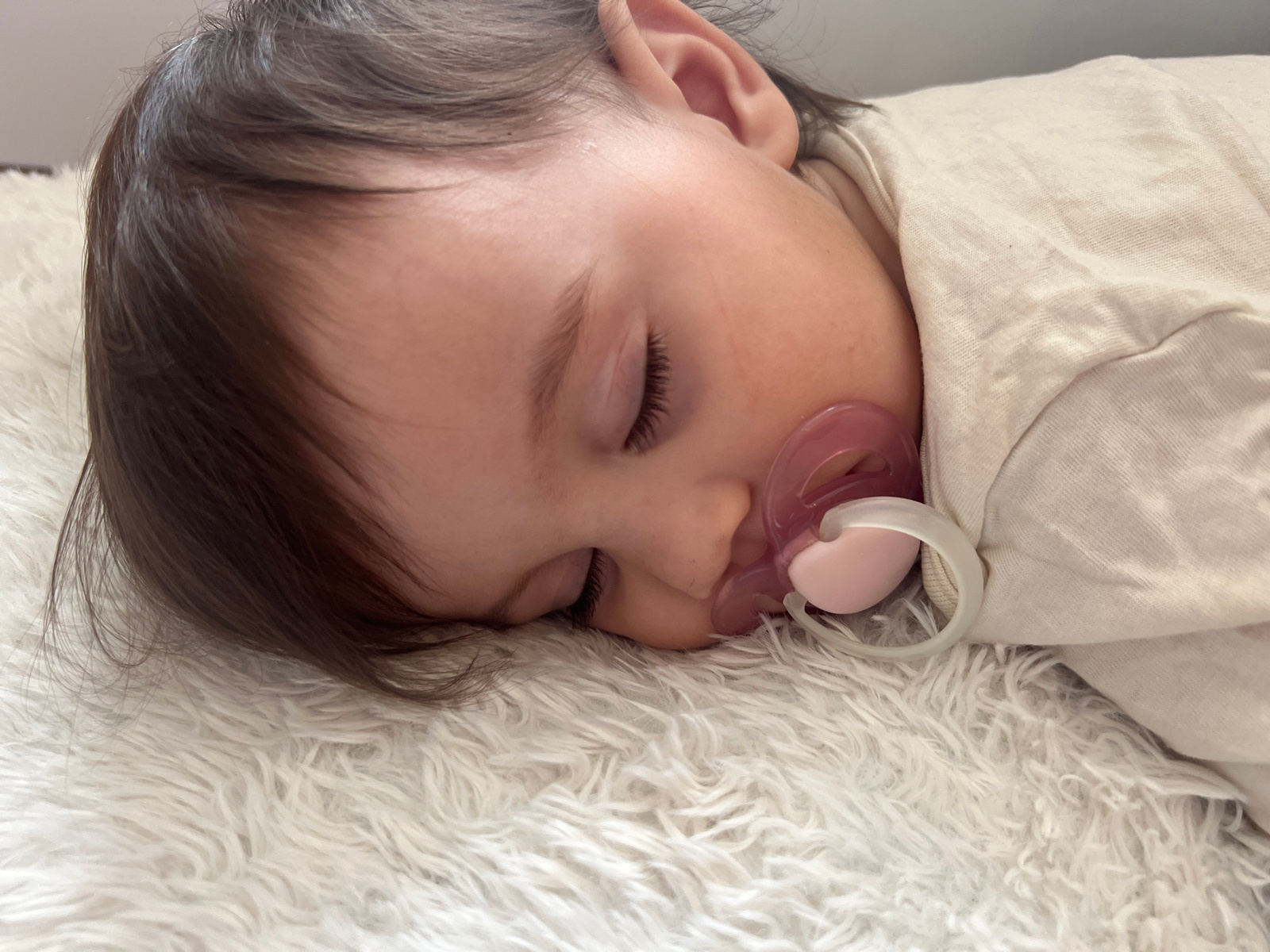 A baby with dark hair and closed eyes is lying on a fluffy white surface. The baby has a pink and white pacifier in its mouth. The baby is wearing a light-colored shirt. The setting is indoors. The lo…read more