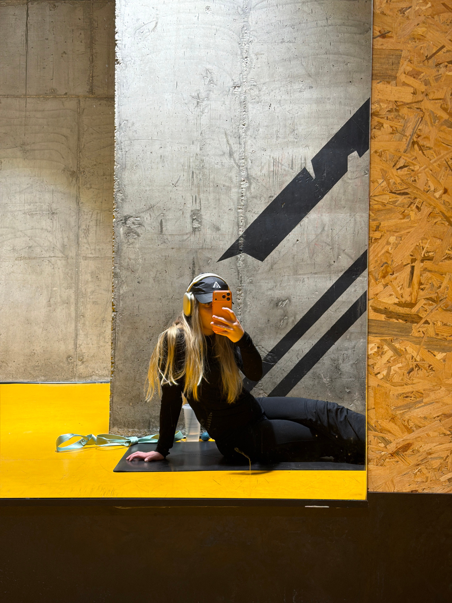 A young woman with long blonde hair, dressed in a black long-sleeved athletic top and black leggings, is depicted lying on a black exercise mat in an interior setting. She wears a white visor, featuriβ¦read more