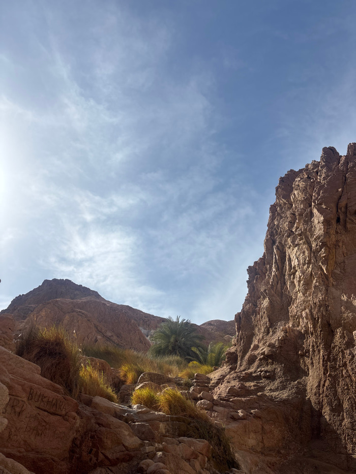 The scene depicts a natural landscape within a wadi or canyon environment, likely in the vicinity of Dahab, Egypt. The upper portion of the frame shows a bright, light-blue sky with scattered, thin wh…read more