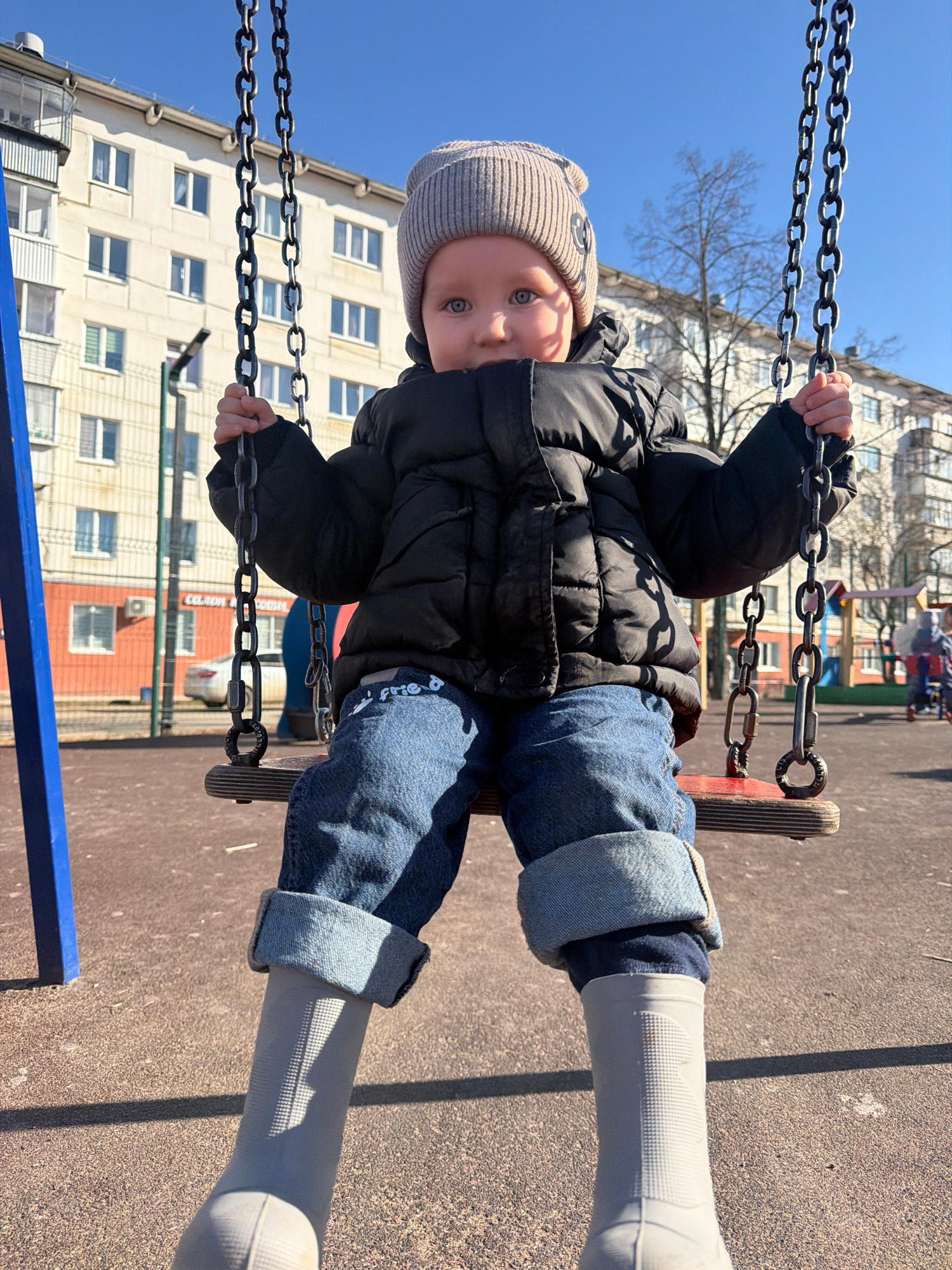 A young child sits on a swing at a playground in Chaikovsky, Russia, on a bright, sunny day. The image is oriented vertically, with the child facing the camera. The child, likely a toddler or preschoβ¦read more
