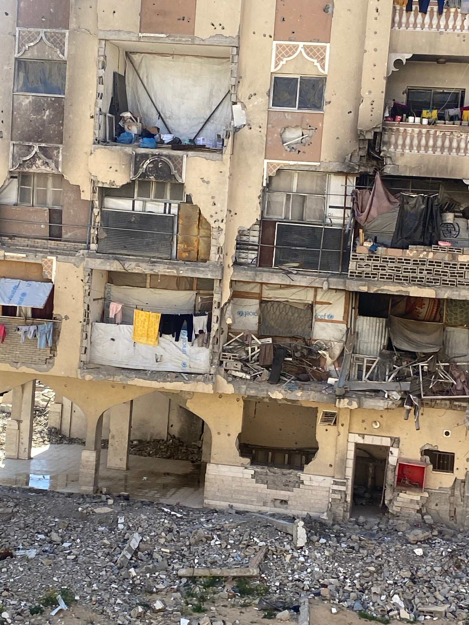 The image depicts a severely damaged multi-story residential building in Khan Yunis, Palestinian Territory. The structure, appearing to be concrete and plaster, exhibits extensive impact damage acrossβ¦read more