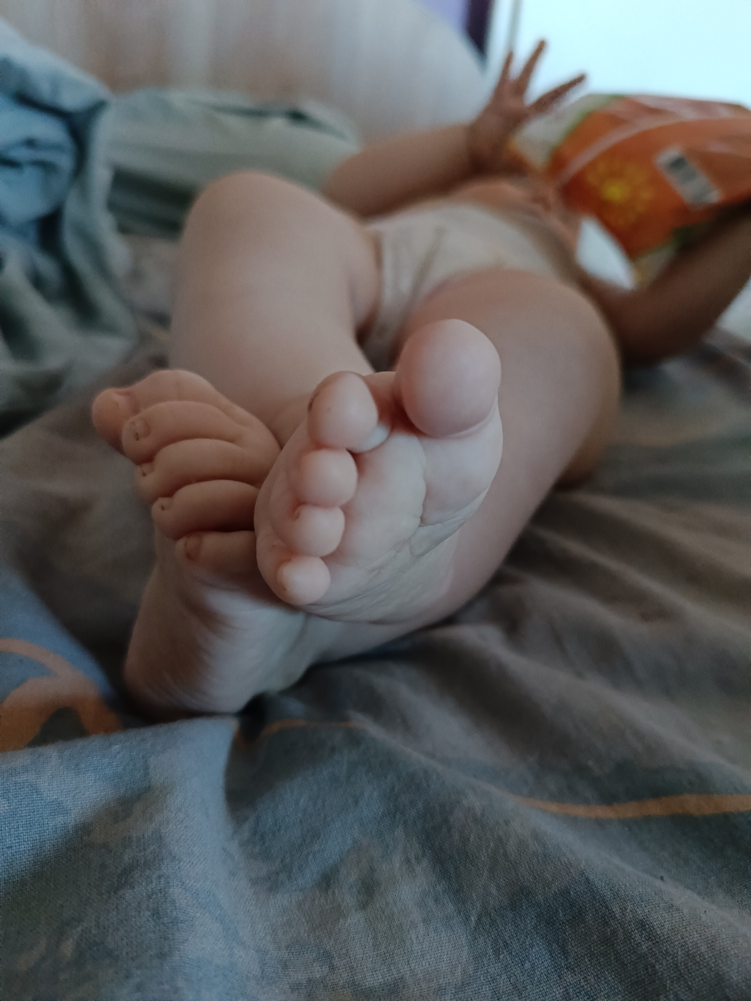 A baby lies on a blue and grey patterned sheet. The baby is wearing a white diaper. The baby's feet are in the foreground, with the toes of one foot closer to the camera than the other. The baby's han…read more