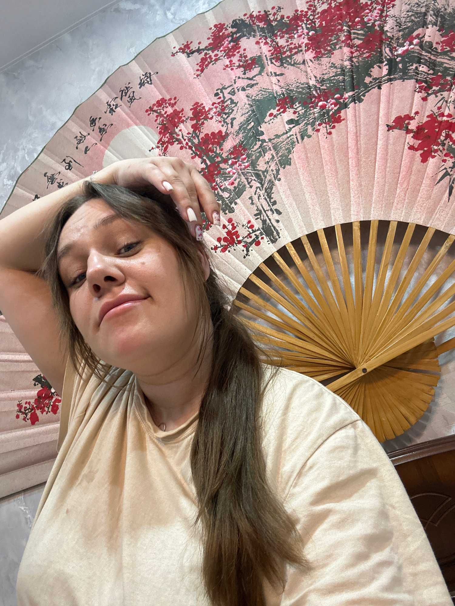 A woman lies on a surface covered with two Asian-style fans. One fan is pink with a floral design and Asian characters. The other is a plain, wooden fan. The woman is wearing a beige shirt and has lon…read more