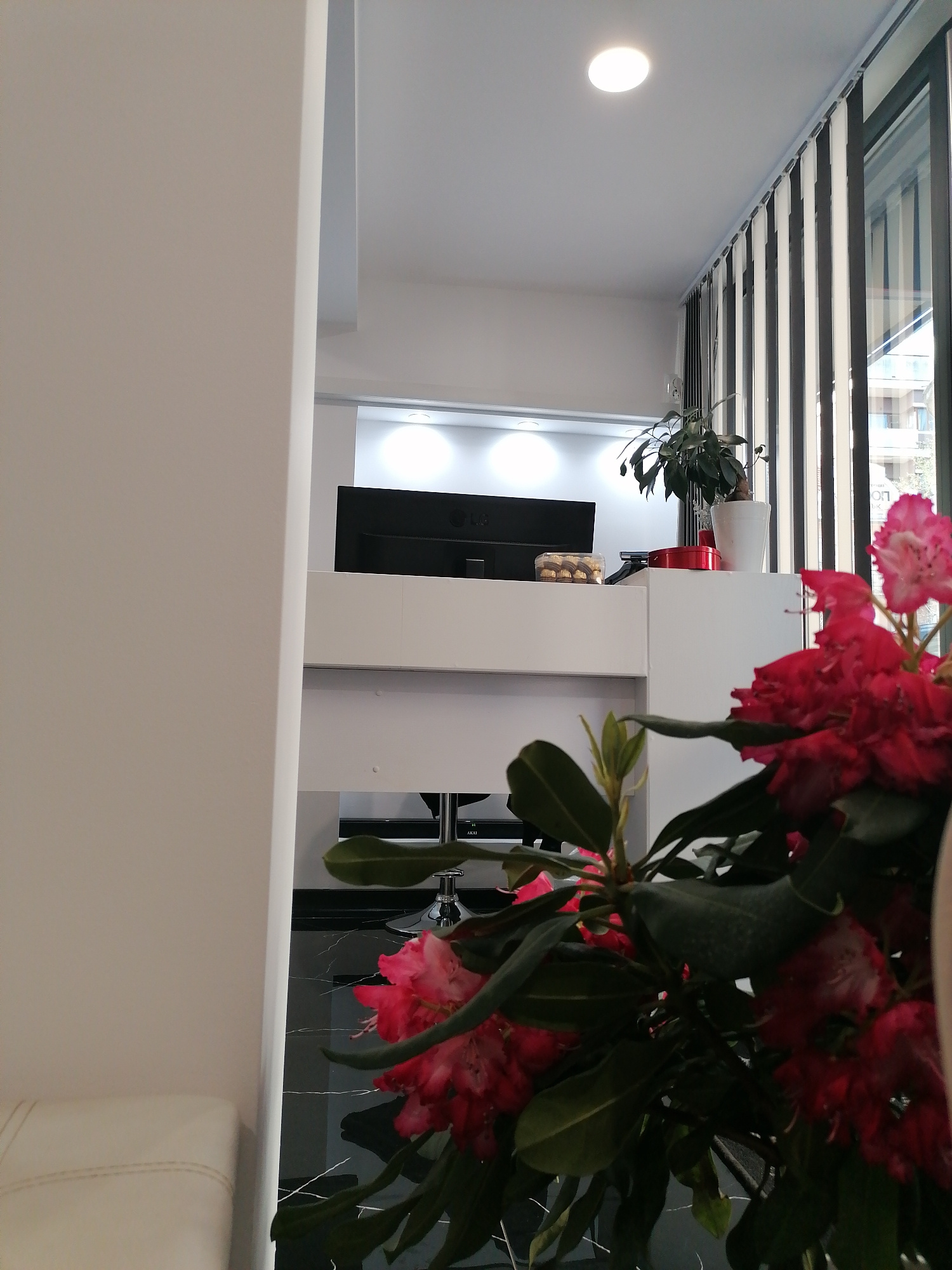 The image depicts an interior space, possibly an office or waiting area, with a modern aesthetic. A white reception desk sits in the background, partially obscured by a large potted plant with red flowers in the foreground. A black computer monitor is visible on the desk, along with a few small containers. Vertical blinds cover a window, providing a glimpse of a building exterior. The space is illuminated by overhead lighting. The floor is black and has a marble pattern. While the image shares similarities with the location of Kazanlak, Bulgaria, it cannot be definitively confirmed without additional information, as it's a generic office setup. | Open Wire