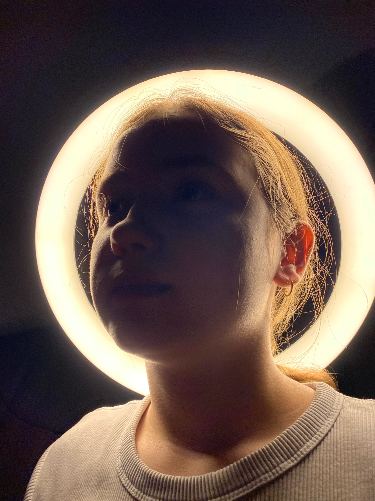 A low-angle shot shows a person’s face surrounded by a circular light. The person has fair skin and light brown or blonde hair. Their head is tilted, and their features are partially obscured by shado…read more