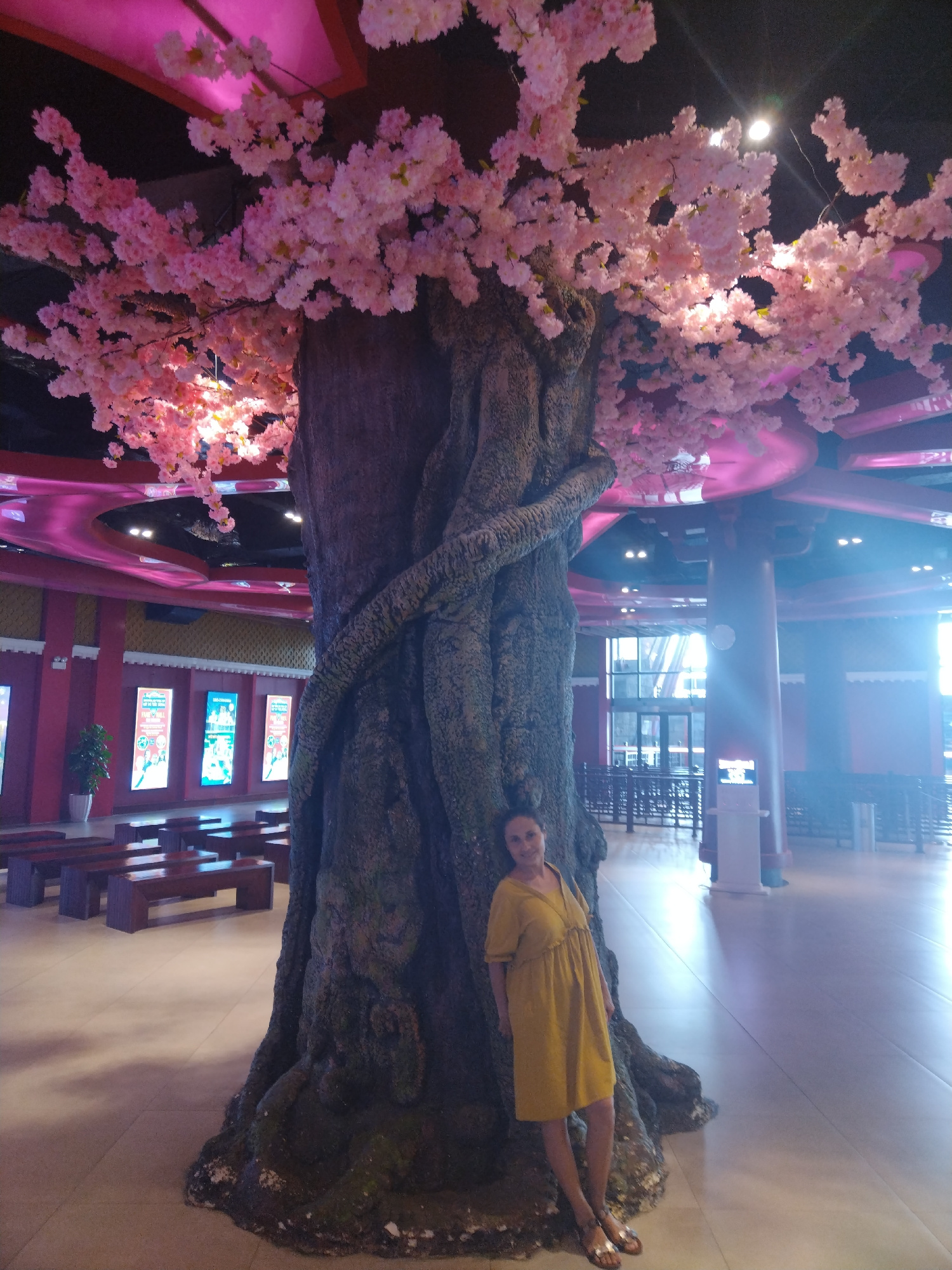 A woman in a yellow dress stands next to a large artificial tree with pink blossoms in what appears to be an indoor shopping mall or entertainment complex. The tree is centrally positioned, acting as…read more