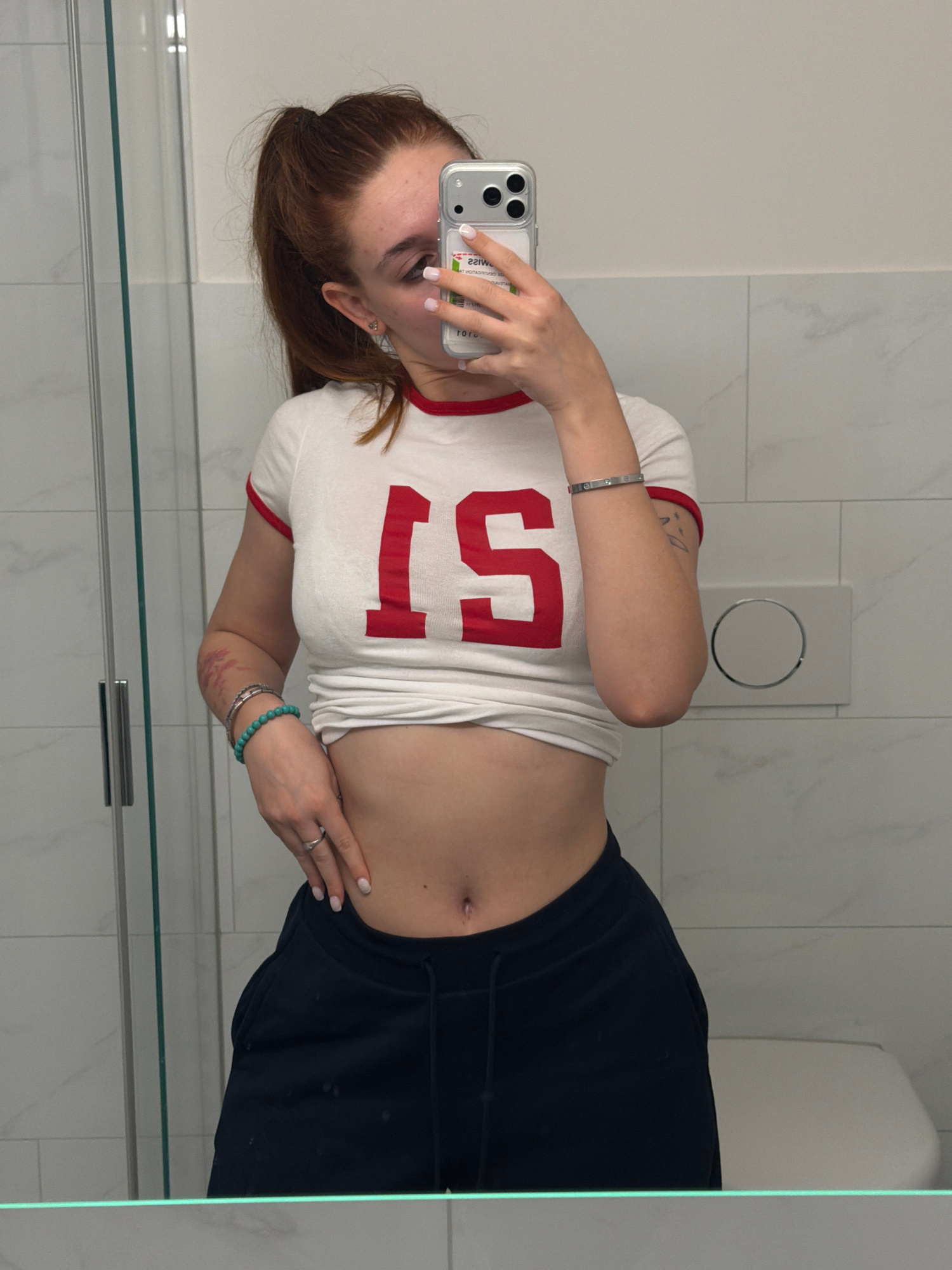 A woman is taking a selfie in a bathroom. She's wearing a white t-shirt with red trim and the number "51" in red. She is also wearing black sweatpants. Her hair is auburn and pulled back. She is holdi…read more