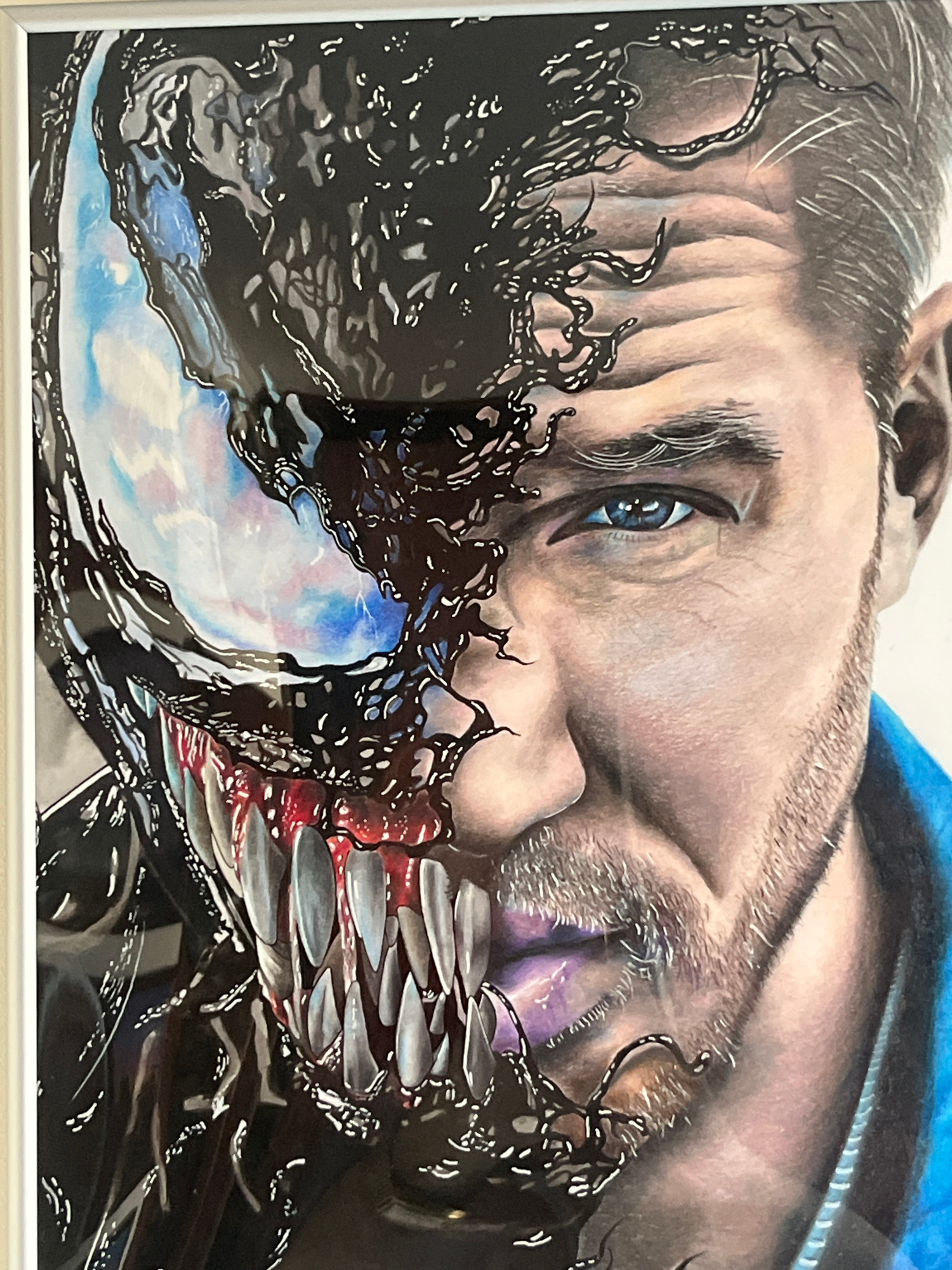 The image depicts a framed artwork featuring a close-up of a man's face partially transformed into Venom. The man has fair skin, blue eyes, and short, grey hair. Part of his face is covered with black…read more