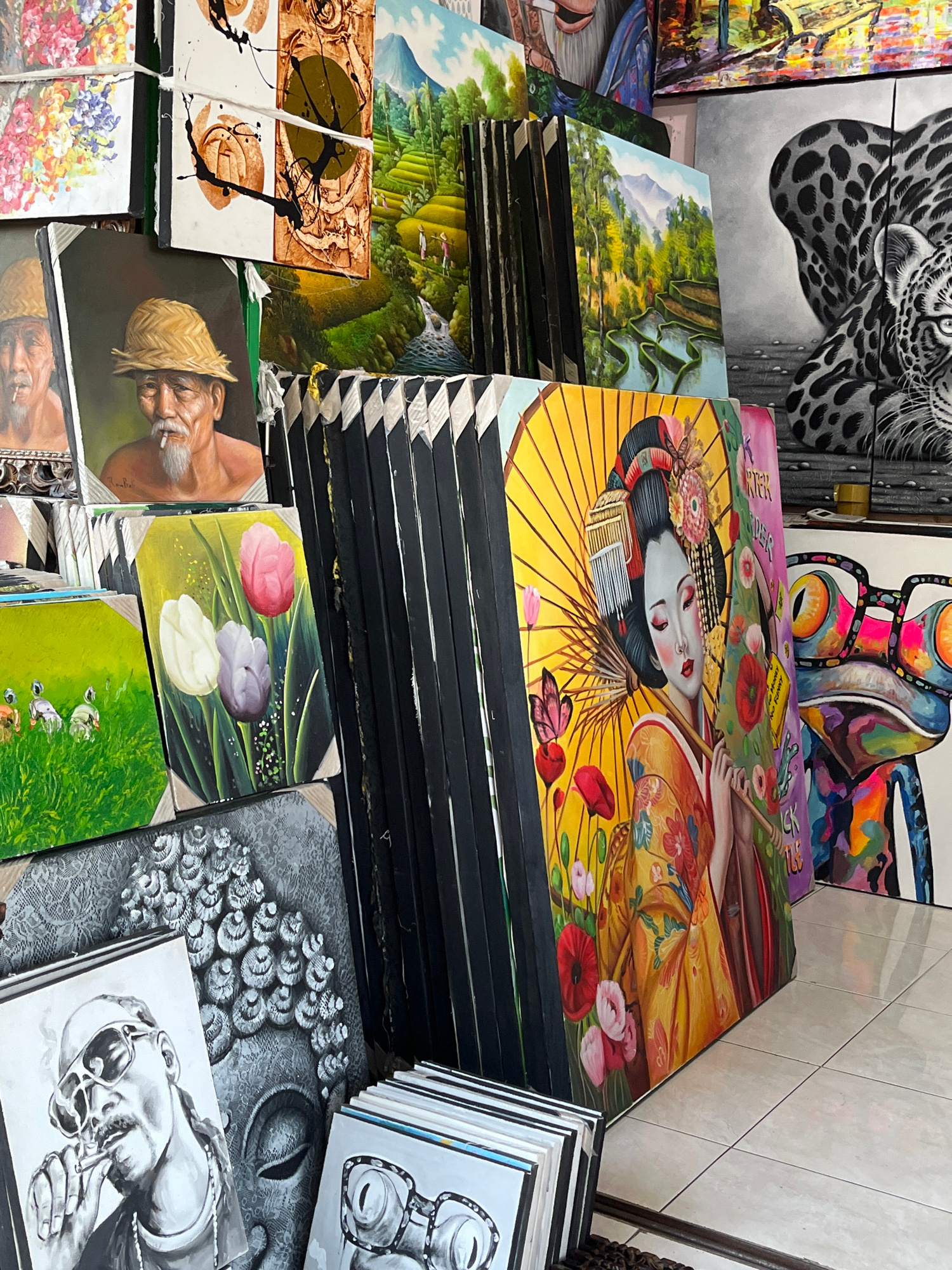 The image depicts a collection of stacked paintings in a shop or market setting in an unknown city in Indonesia. The paintings cover a variety of subjects, including landscapes, portraits, abstract ar…read more