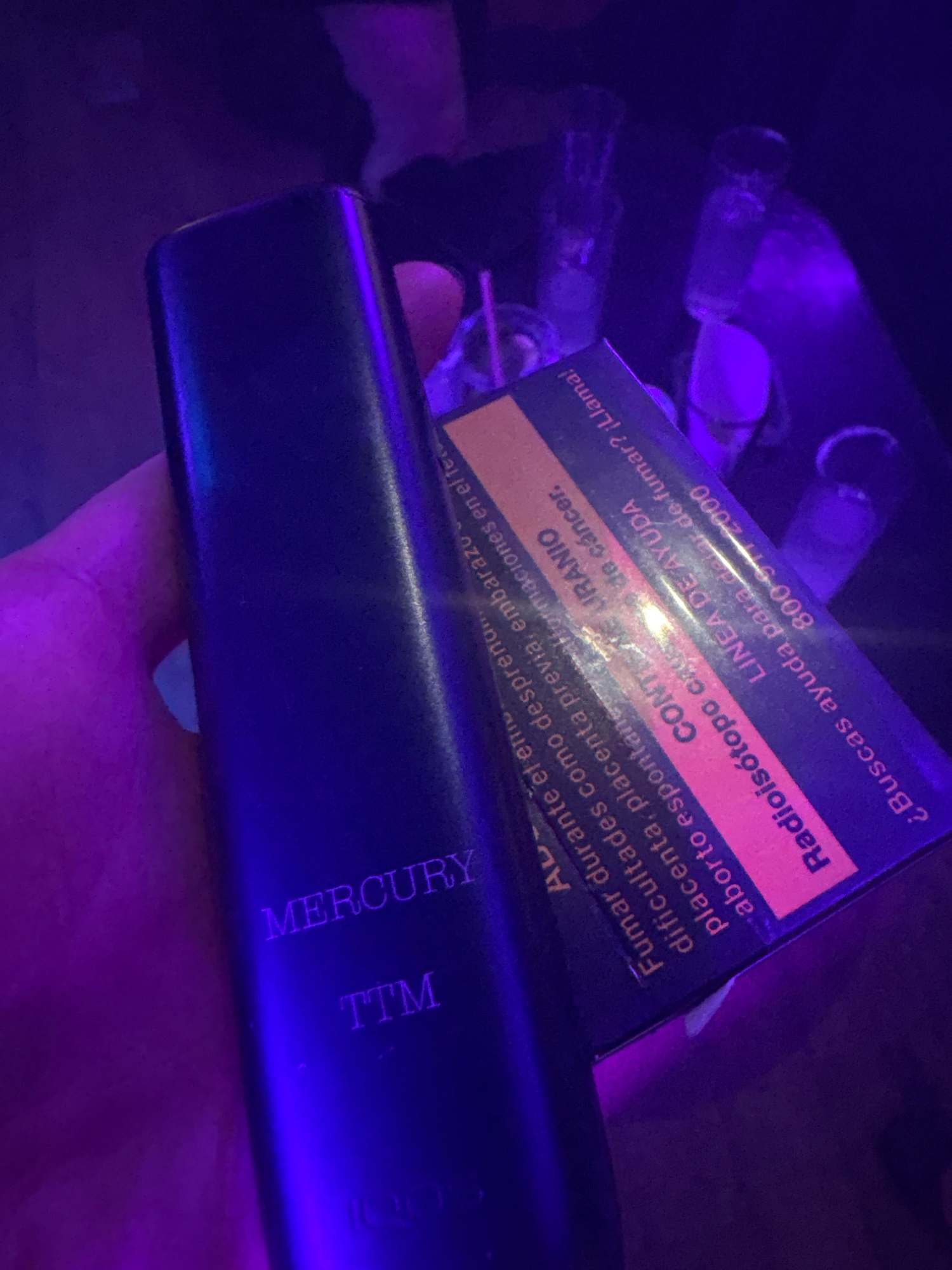 A hand holds a black Mercury TTM vaporizer next to a cigarette pack labeled “Radioisotopo.” The cigarette pack includes text in Spanish stating that smoking during pregnancy can cause complications an…read more