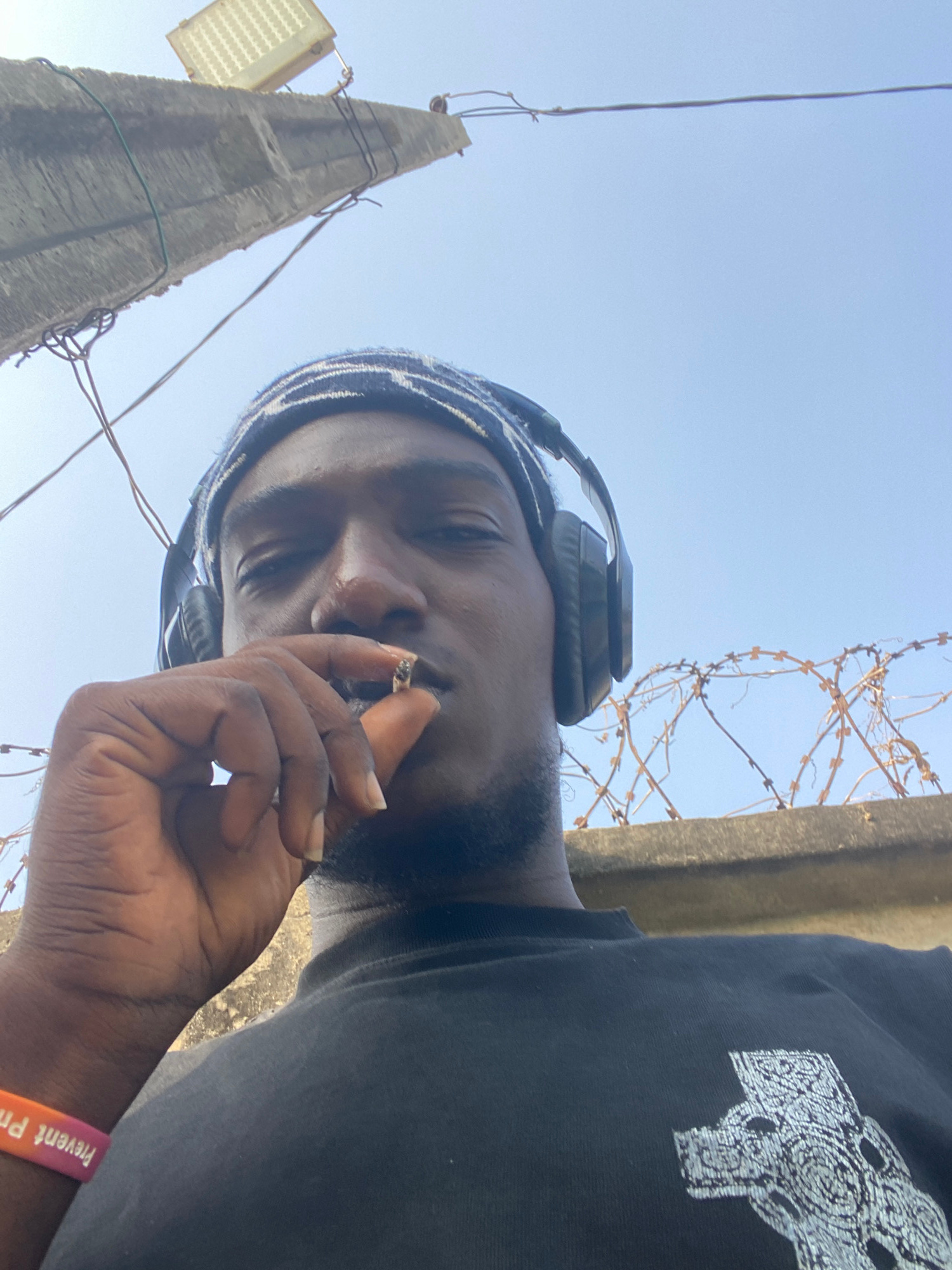 The image shows a dark-skinned man wearing headphones and a striped head covering, holding what appears to be a marijuana cigarette near his mouth. He is wearing a black T-shirt with a white design an…read more