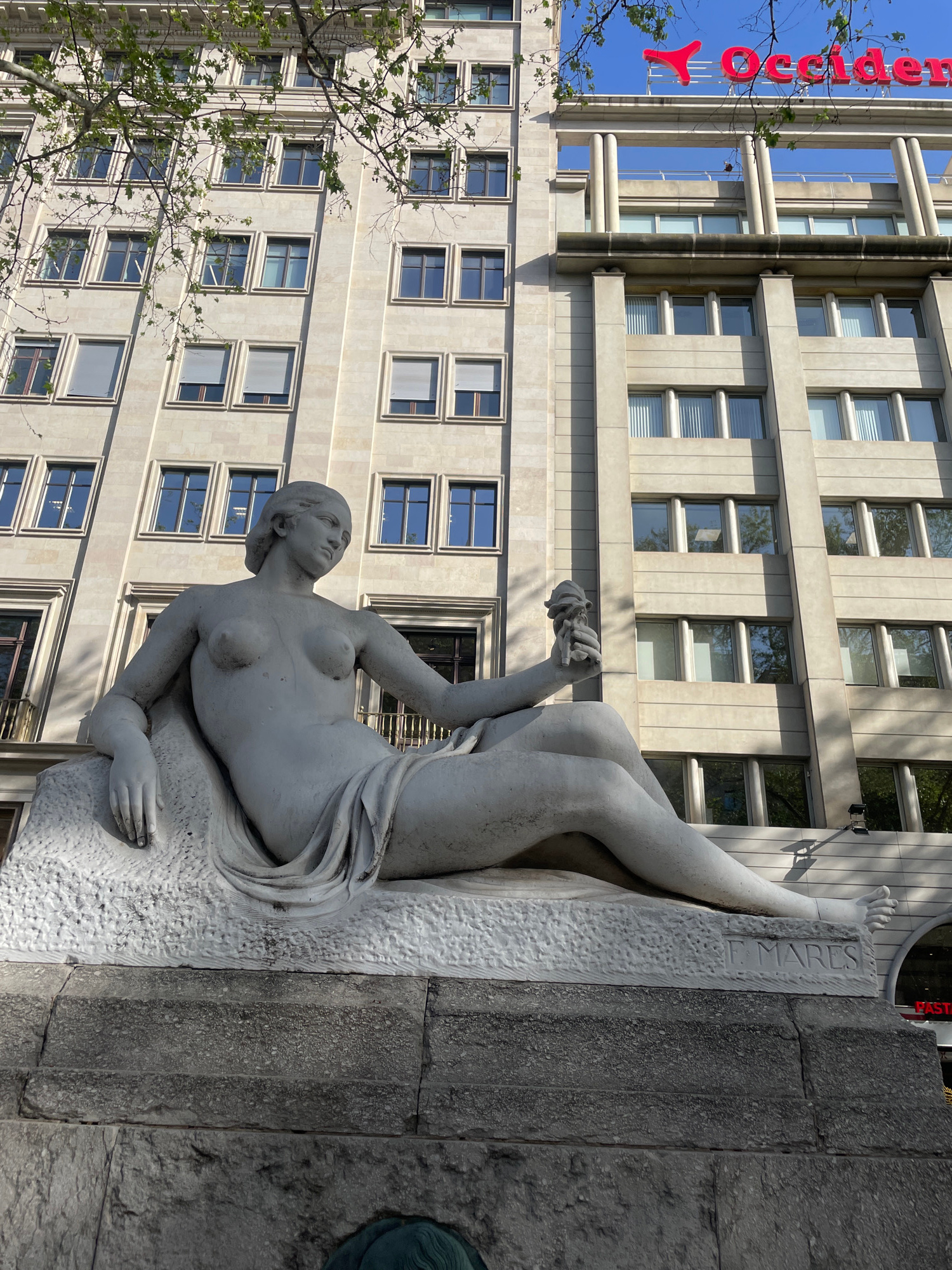 The image shows a reclining nude statue of a woman, possibly made of marble or a similar light-colored stone. The statue is placed on a stone base with inscriptions on it. The background features a ta…read more