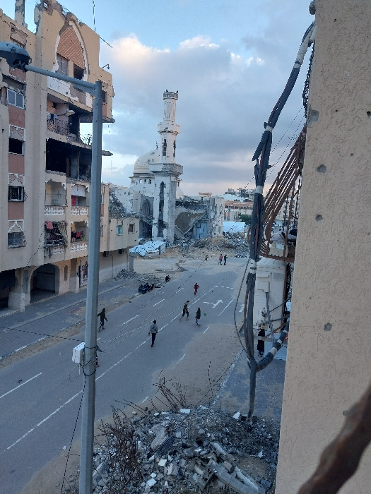An elevated view captures a street scene in Khan Yunis, Palestinian Territory, depicting extensive structural damage to the surrounding urban environment. In the center-background stands a large mosqu…read more