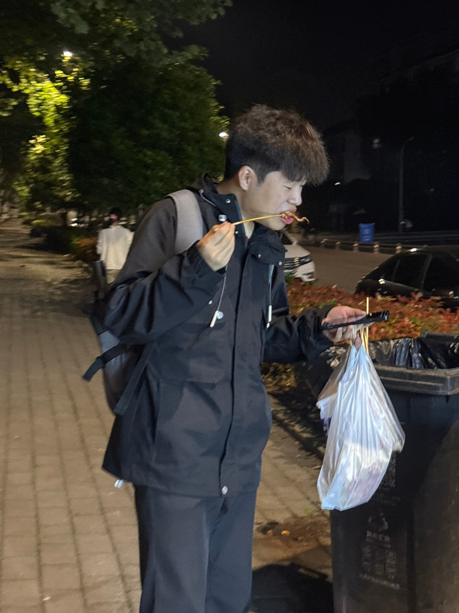 A male with dark, curly hair and a black jacket is eating food on a stick in Jiangjin, China. He holds a plastic bag and other food skewers in his left hand. The background includes a brick walkway, t…read more