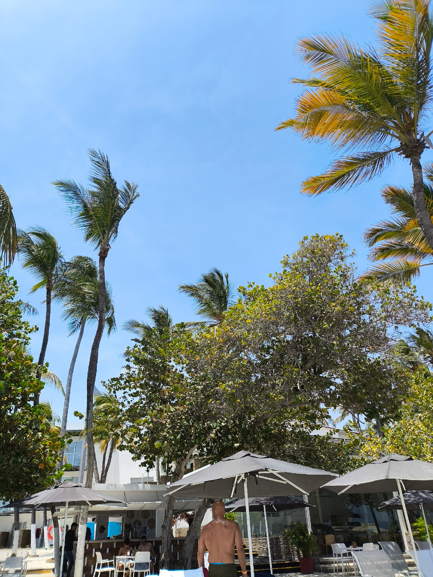 Captured in El Yaque, Venezuela, the scene is a tropical beach setting under a clear blue sky. Towering palm trees frame the upper portion of the image, their fronds swaying in the breeze. Below, the…read more